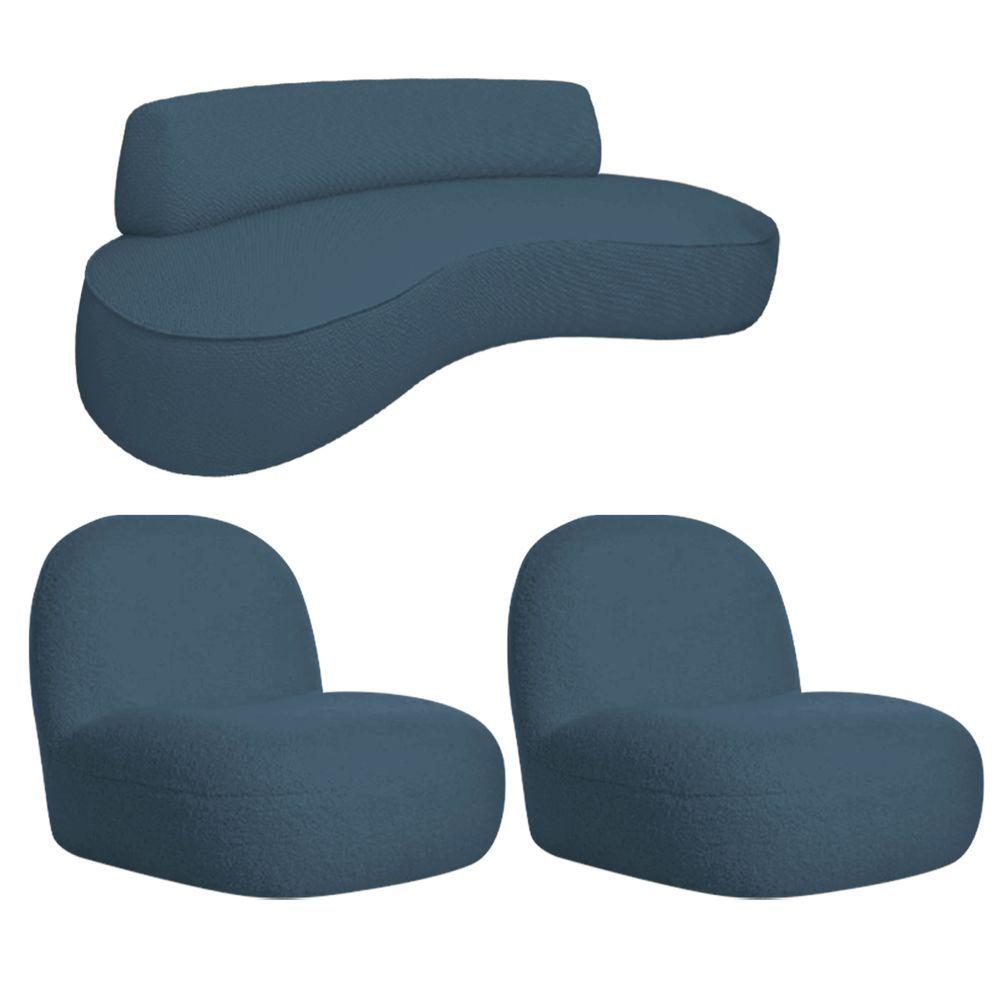 Sofá Curvo 140cm 2 Lugares E 2 Poltrona Amsterdã Linho Adj Decor Azul Royal