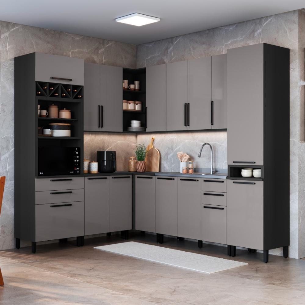 Cozinha Modulada Completa Fidelitá Mônaco 8 Peças 469cm 15 Portas 4 Gavetas Sem Tampo Chumbo/titânio