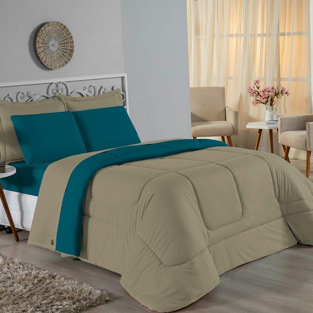 Edredom Queen Nobre 1 Peça Dupla Face 2,20m X 2,40m Malha 100% Algodão - Avelã / Petróleo