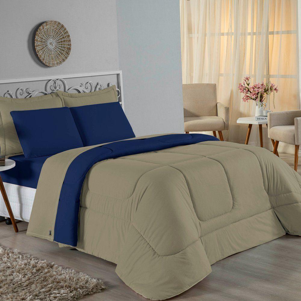 Edredom Queen Nobre 1 Peça Dupla Face 2,20m X 2,40m Malha 100% Algodão - Avelã / Azul-marinho