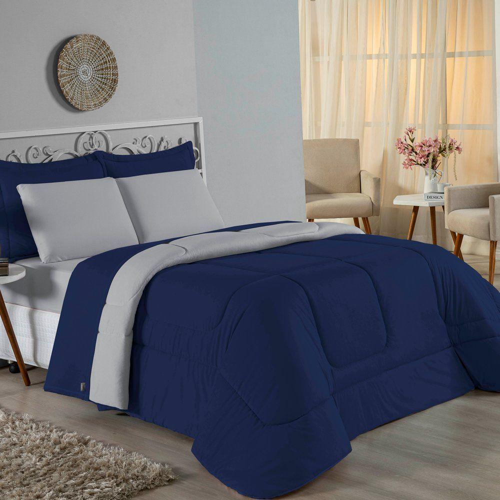 Kit Edredom Dupla Face + Jogo De Lençol Casal Nobre 7 Peças Malha 100% Algodão - Azul-marinho / Cinza