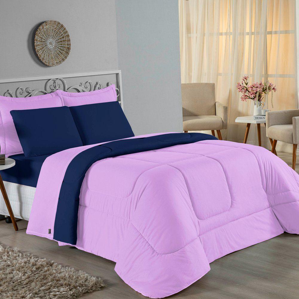 Kit Edredom Dupla Face + Jogo De Lençol Casal Nobre 7 Peças Malha 100% Algodão - Lilás / Azul-marinho