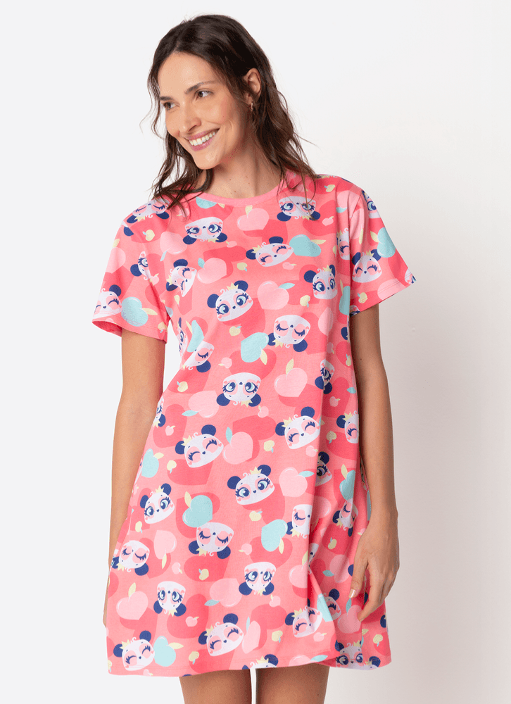 Camisola Manga Curta Algodão Feminina Panda Romântico