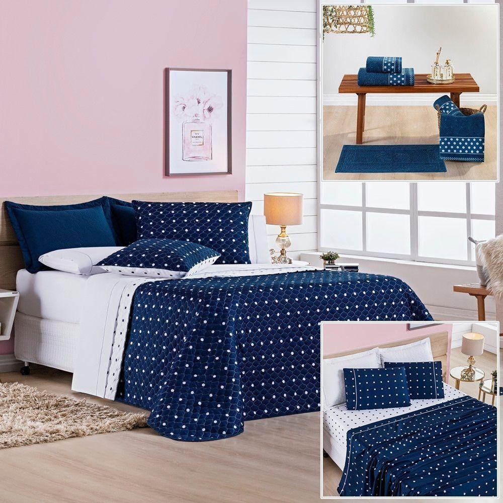 Cobre Leito + Jogo De Cama King + Jogo De Banho Petit Poá 12 Peças 100% Poliéster - Marinho