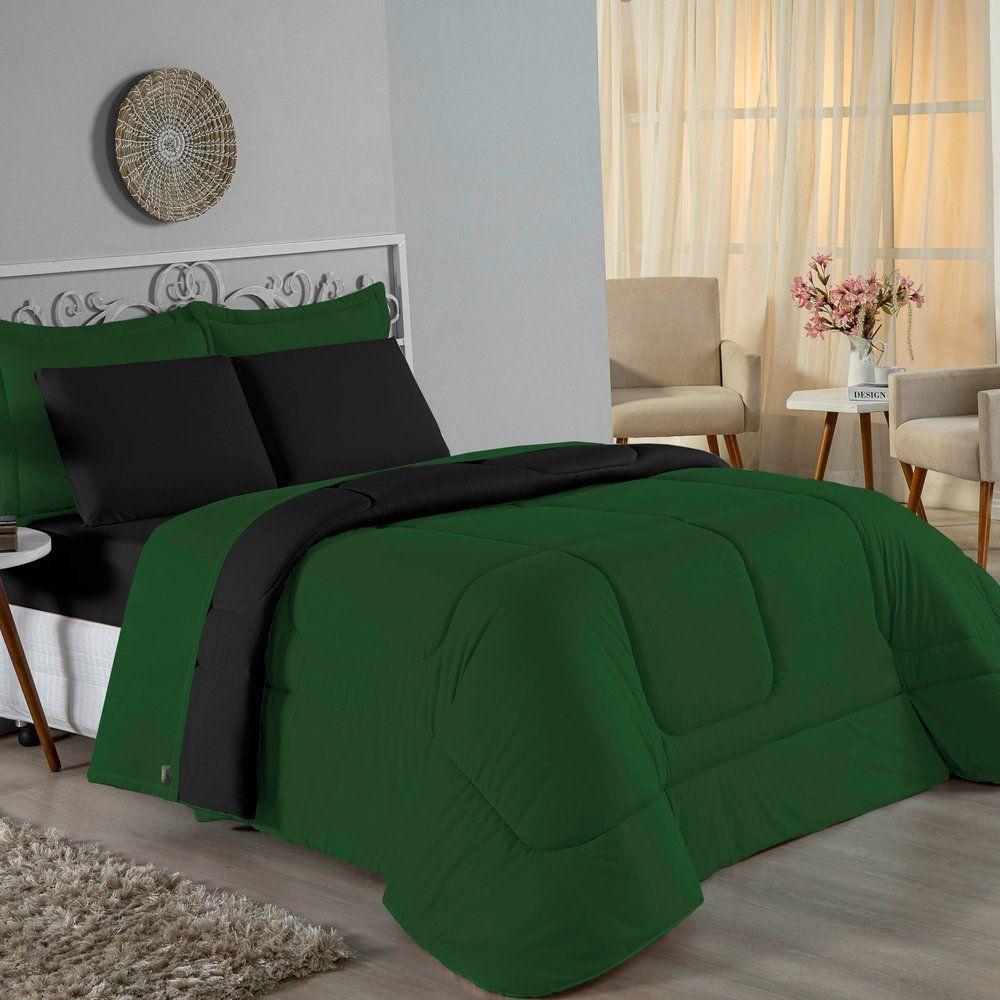 Kit Edredom Dupla Face + Jogo De Lençol Casal Nobre 6 Peças Malha 100% Algodão - Verde-bandeira / Preto