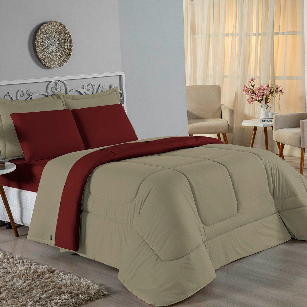 Kit Edredom Dupla Face + Jogo De Lençol Casal Nobre 6 Peças Malha 100% Algodão - Avelã / Vinho