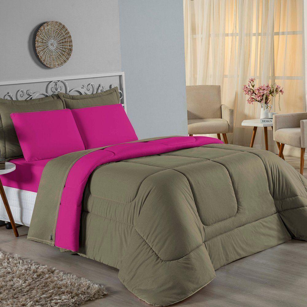 Kit Edredom Dupla Face + Jogo De Lençol Casal Nobre 7 Peças Malha 100% Algodão - Avelã / Pink