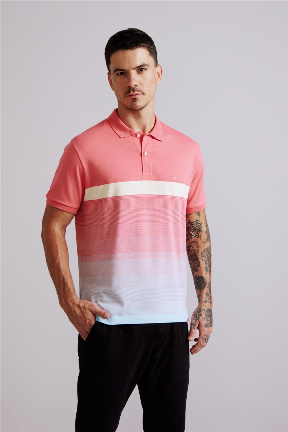 Camisa Polo Comfort Malha - Rosa Salmão / Azul Céu