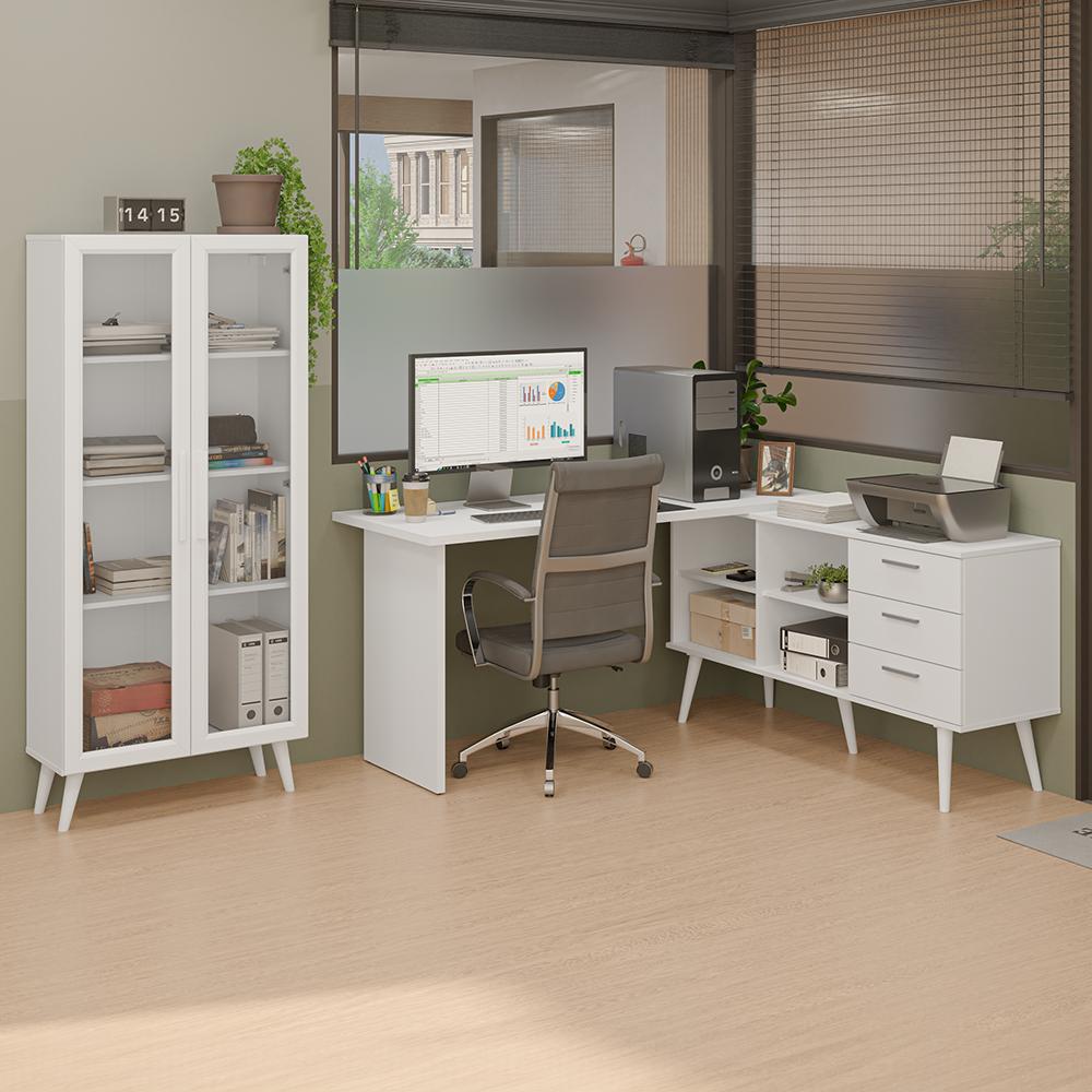 Kit 2 Peças com Escrivaninha em L 3 Gavetas e Armário Multiuso com Vidro Branco Madesa