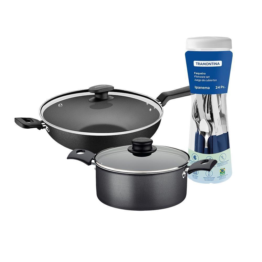 Caçarola Turim Alumínio Chumbo Antiaderente 2,8l + Faqueiro Ipanema 24pc + Wok Loreto 3,3l