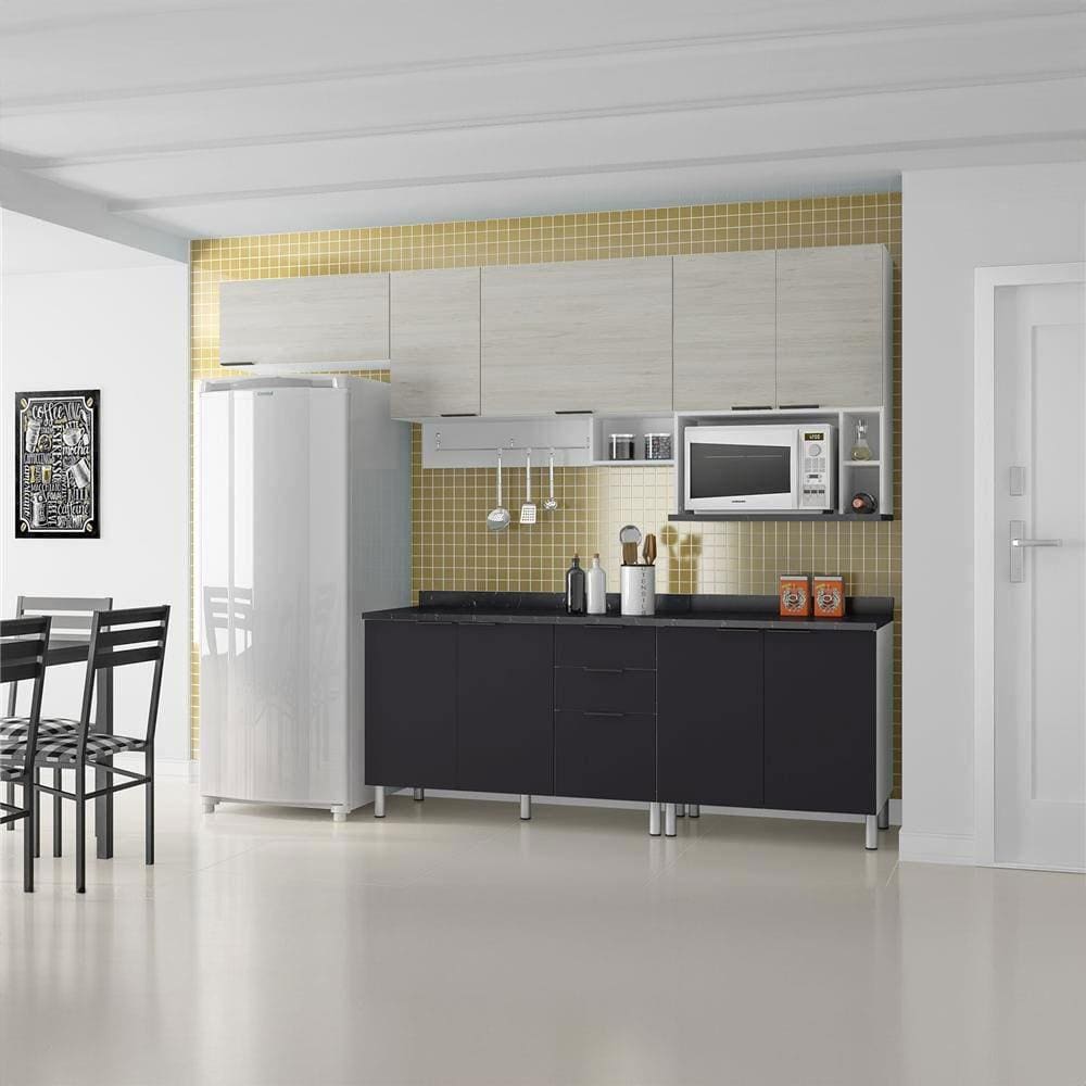 Cozinha Compacta Bartira Rubi com 7 Portas, 4 Prateleiras e 3 Gavetões Freixo/Preto Poah – 360,1 cm Largura