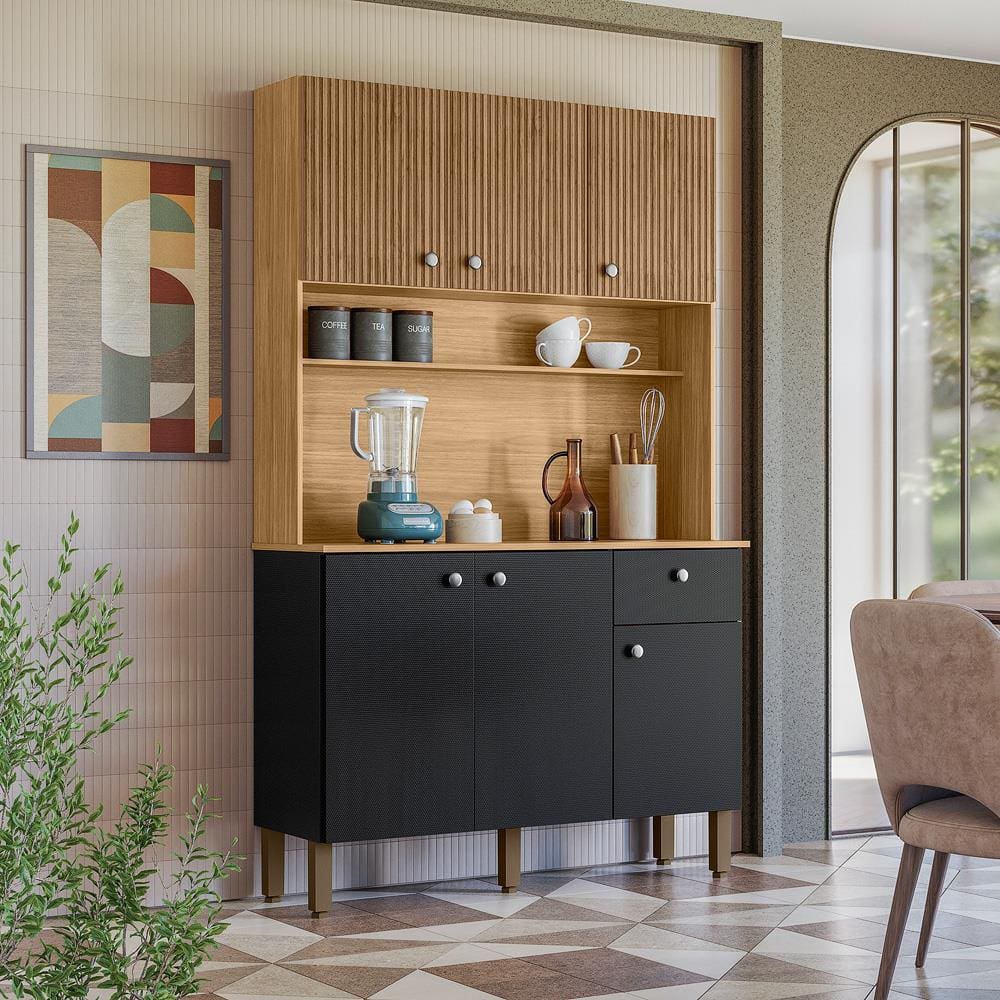 Cozinha Compacta Kits Paraná Style 6 Portas 1 Gaveta Ripado Freijó Puxador Inox Pés Reguláveis