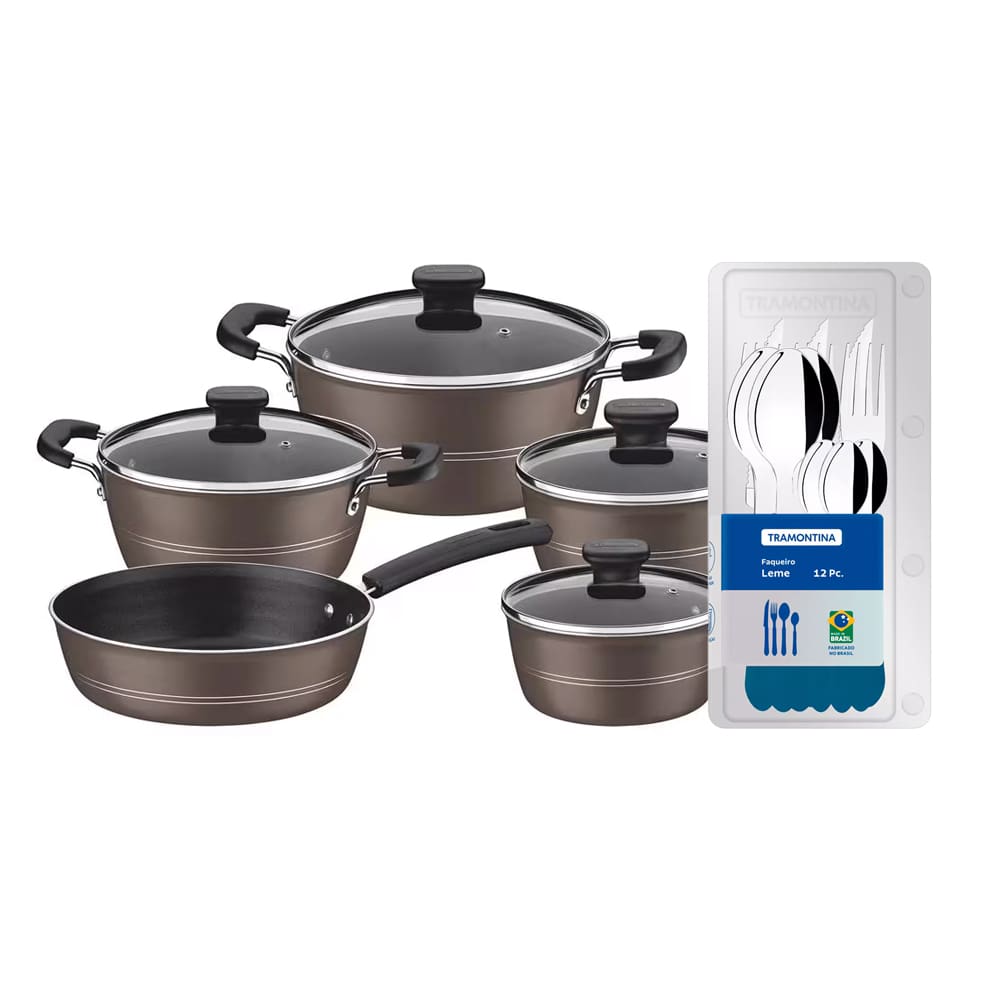 Conjunto de Panelas Tramontina Sicilia com Revestimento Starflon Excellent Avelã – 5 Peças + Faqueiro 12 Peças Tramontina Leme - Azul