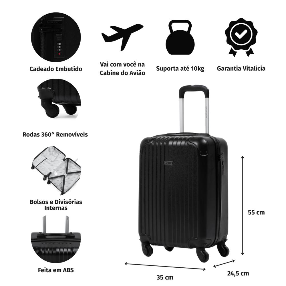 Mala Turquia - (Mala de Bordo) A Mala de Bordo ABS 4 Rodas Bagaggio Turquia 20" Preta com seu tamanho de bordo, é perfeito para viagens curtas. Seu design é mais simples, ideal para quem deseja uma mala rígida pagando pouco. Ela é produzida em ABS, um material super leve e rígido, que deixa seu transporte bem mais prático. Seu tamanho permite que seja levada no interior do Avião. Possui 4 rodas simples com giro 360º, alça de mão superior e cadeado fixo, para sua maior segurança. Disponível nas cores: Preta, Azul Marinho, Mostarda, Vermelha e Roxo Claro Principais Atributos Cadeado: A mala de viagem Turquia, conta com cadeado embutido ideal para garantir uma segurança extra, no momento de viajar. Além disso, o cadeado presente no modelo possui um design discreto que o torna mais difícil de ser notado. Rodas 360°: As rodinhas 360° permitem que você gire sua mala para qualquer direção, sem esforço nenhum. Elas são uma ótima opção para quem viaja muito e precisa se locomover para vários lugares de forma rápida e fácil. Espaço interno: Com a Turquia, você consegue acomodar todos os seus pertences e roupas, de forma organizada e segura. A mala conta com divisórias simples em zíper, bolso telado interno e elásticos com trava, ideais para manter seus itens no lugar. Além disso, ela possui amplo espaço interno. Material - ABS Devido às suas excelentes propriedades mecânicas, o ABS é um material bastante resistente e flexível. Além disso, ele é perfeito para malas, pois é leve, fácil de limpar e proporciona qualidade ao produto. Tamanho disponível P: A: 55 x L: 30 x P: 24,5 | 2,43kg Bagaggio responde - Esse produto possui garantia? Sim, a mala conta com garantia vitalícia. *Confira o Regulamento - Quantos kg essa mala comporta? No caso desse modelo de mala que possui um tamanho de bordo, comporta até 10kg. - Posso levá-la comigo dentro do avião? SIM, é um modelo de mala de bordo - Quanto pesa esta mala? A mala Turquia conta com um peso de 2,43kg.