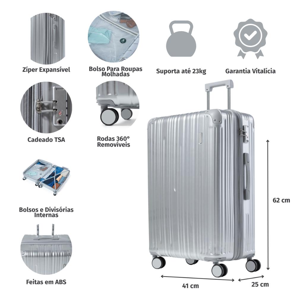 A Mala Monte Carlo média é perfeita para quem precisa carregar bastante coisa na bagagem e não quer abrir mão do estilo. O modelo traz detalhes frisos em sua estrutura rígida que deixam a sua bagagem muito mais segura e aumentam a durabilidade da sua mala. Com alça de mão superior, a mala de viagem possui carrinho em alumínio embutido, deixando o produto mais leve. Além disso, possui 4 rodas duplas que possibilitam giro 360º. Internamente, ela é forrada e possui cintas elásticas que facilitam a organização da sua bagagem. No compartimento da sua tampa, é equipada com uma divisória e bolso telado, ambos com fecho em zíper. DIFERENCIAIS - Design com detalhes frisos; - Estrutura rígida; - Alça de mão superior; - Carrinho em alumínio embutido; - 4 rodas duplas com giro 360º; - Forro em nylon; - Cintas elásticas com trava; - Divisória e bolso telado, ambos com fecho em zíper; - Amplo espaço interno. Rodas 360º: Rodas 360° As rodas com giro 360º facilitam o deslocamento da mala de viagem, fazendo com que ela possa ser conduzida em qualquer direção, sem precisar incliná-la e sem fazer esforço. Amplo espaço interno: Amplo compartimento Interno A mala de viagem conta com divisórias simples e elásticos com trava, ideais para manter seus itens no lugar. Além disso, ela possui amplo espaço interno. Cadeado com Senha: Cadeado com senha embutido O cadeado com senha vem embutido na mala. Nele, você cadastra uma senha numérica para prender os fechos e viajar com mais segurança. Mala de ABS: