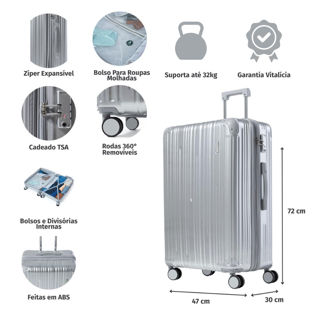 A Mala Monte Carlo grande é perfeita para quem precisa carregar bastante coisa na bagagem e não quer abrir mão do estilo. O modelo traz detalhes frisos em sua estrutura rígida que deixam a sua bagagem muito mais segura e aumentam a durabilidade da sua mala. Com alça de mão superior, a mala de viagem possui carrinho em alumínio embutido, deixando o produto mais leve. Além disso, possui 4 rodas duplas que possibilitam giro 360º. Internamente, ela é forrada e possui cintas elásticas que facilitam a organização da sua bagagem. No compartimento da sua tampa, é equipada com uma divisória e bolso telado, ambos com fecho em zíper. DIFERENCIAIS - Design com detalhes frisos; - Estrutura rígida; - Alça de mão superior; - Carrinho em alumínio embutido; - 4 rodas duplas com giro 360º; - Forro em nylon; - Cintas elásticas com trava; - Divisória e bolso telado, ambos com fecho em zíper; - Amplo espaço interno."Especificações: Material: ABSPeso (kg): 4,5KgDimensões: 72 X 47 X 30 CMCapacidade: 101 lCor: Prata Marca: BagaggioFaixa Etária: Adulto