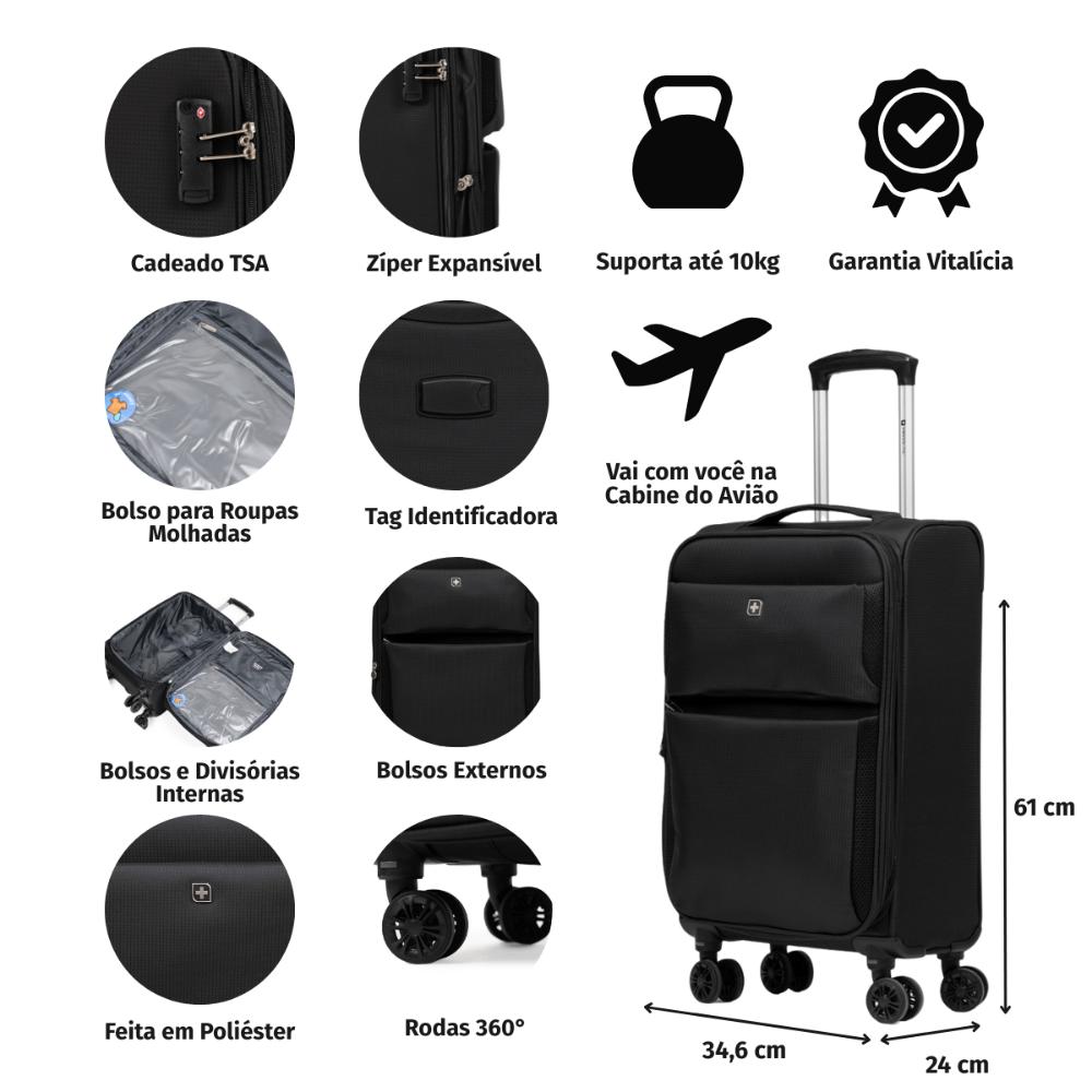 Mala Pequena Poliester 4 Rodas Verbier Swiss One 20,5" Segurança, modernidade, praticidade, conforto e qualidade, a Mala Swiss One Verbier média é a mala perfeita para sua viagem curta ou mais longa. Com design suíço e customizado, é feita em material super leve e resistente, garantindo proteção total aos seus pertences. Prática e confortável, ela é ideal para ser levada a qualquer lugar. Suas 4 rodas tem giro de 360º. Além disso, conta ainda com dois bolsos externos para você ter fácil acesso a itens menores. O modelo é semirrígido e produzido em poliéster, material fácil de limpar. Por dentro, conta com um bolso menor e um bolso para itens molhados, ambos com fecho em zíper, além de cintas elásticas para garantir a organização da sua bagagem. Dentre seus diferenciais, estão cadeado TSA, rodas 360º, forro em nylon, bolso interno para itens molhados com fecho em zíper, aplicação de logo personalizada e sua estrutura semirrígida.