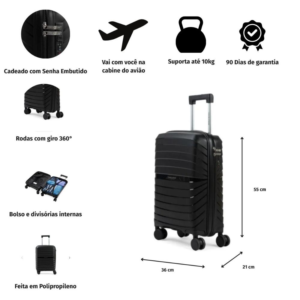 Mala de Viagem Pequena 10 Kg Polipropileno 4 Rodas Rover Preta
