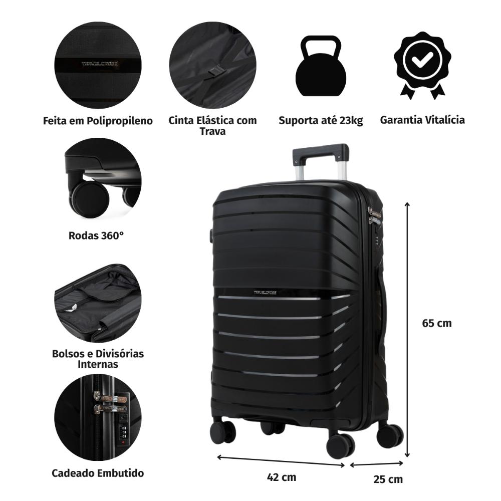 Mala Média 23 Kg Polipropileno 4 Rodas Rover Preta A Mala Rover possui um design moderno, urbano e sofisticado, a mala é produzida em polipropileno, um material resistente e durável, que garante maior segurança para seus pertences durante a viagem. Tamanhos disponível: 65 x 42 x 25 cm Principais Atributos Rodas 360° As rodas com giro 360º facilitam o deslocamento da mala, fazendo com que ela possa ser conduzida em qualquer direção, sem precisar incliná-la e sem fazer esforço. Amplo compartimento Interno A mala conta com divisórias simples e elásticos com trava, ideais para manter seus itens no lugar. Além disso, ela possui amplo espaço interno. Divisórias internas A mochila contém divisórias internas que facilitam a organização dos itens do seu bebê durante o dia a dia. Bagaggio responde Essa mala da Bagaggio tem garantia? Sim, a Mala Rover conta com 90 dias de garantia para defeitos de fábrica. Qual litragem essa mala comporta? A Mala Rover comporta até 68L.