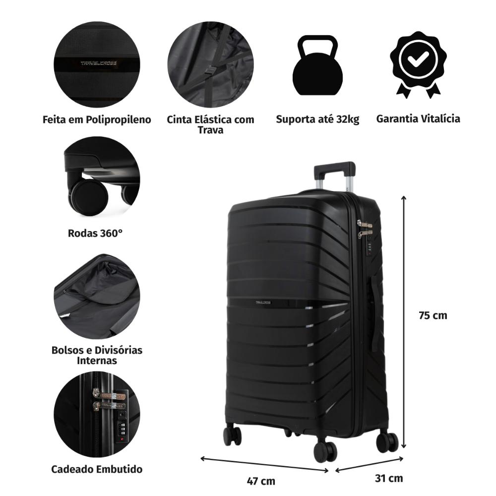 Mala de Viagem Grande 32 Kg Polipropileno 4 Rodas Rover Rose A Mala Rover possui um design moderno, urbano e sofisticado, a mala é produzida em polipropileno, um material resistente e durável, que garante maior segurança para seus pertences durante a viagem. Tamanhos disponível: 75 x 47 x 31 cm Principais Atributos Rodas 360° As rodas com giro 360º facilitam o deslocamento da mala, fazendo com que ela possa ser conduzida em qualquer direção, sem precisar incliná-la e sem fazer esforço. Amplo compartimento Interno A mala conta com divisórias simples e elásticos com trava, ideais para manter seus itens no lugar. Além disso, ela possui amplo espaço interno. Cadeado TSA A melhor opção para proteger sua bagagem em voos internacionais. Os cadeados TSA possuem abertura para uma chave universal, assim, a segurança do aeroporto consegue abrir o cadeado e inspecionar a bagagem sem precisar estourar o cadeado e danificar sua mala. Divisórias internas A mala contém divisórias internas que facilitam a organização dos itens durante a dua viagem. Bagaggio responde Essa mala da Bagaggio tem garantia? Sim, a Mala Rover conta com 90 dias de garantia para defeitos de fábrica. Qual litragem essa mala comporta? A Mala Rover comporta até 109L.