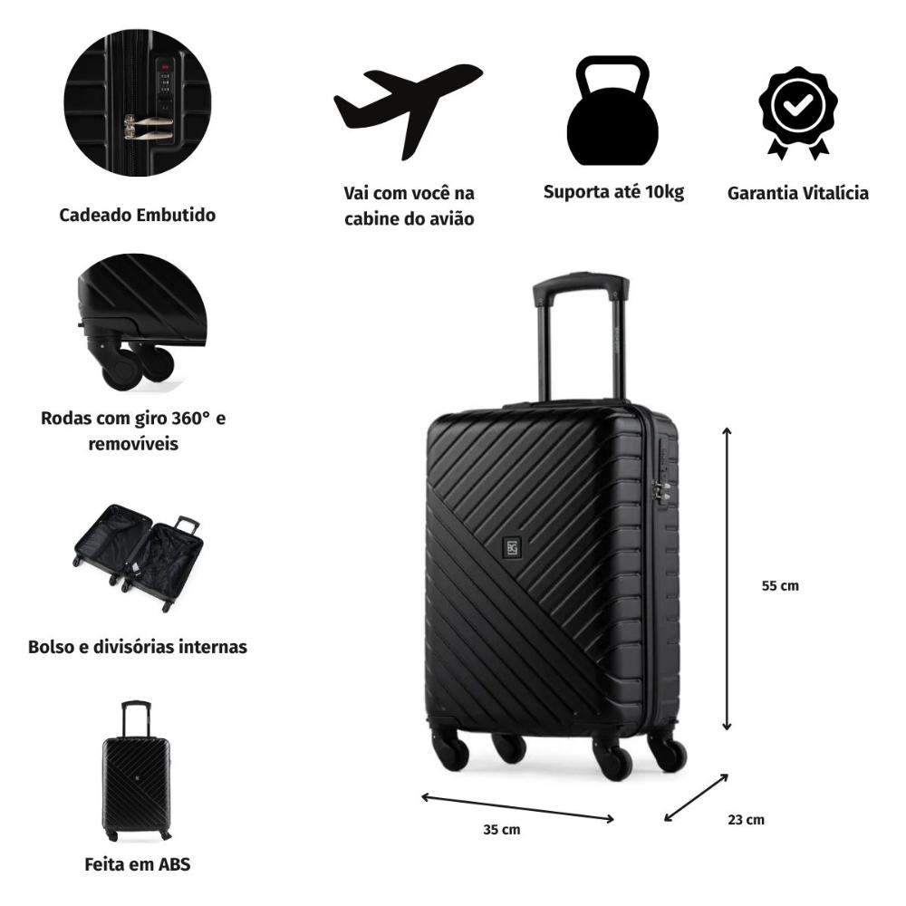 A mala Detroit é uma das queridinhas da Bagaggio! A Mala de Bordo detroit comprta até 10 kg e pode ir com você dentro do avião. Com o seu design elegante e clássico, conta com 4 rodas com giro de 360°, facilitando o transporte da mala. Para maior segurança, esse modelo conta com cadeado fixo, trazendo tranquilidade paras as suas viagens. Além disso, possui compartimentos em zíper e cinta para organizar melhor os seus pertences. Diferenciais: - Vai à Bordo - Cadeado fixo; - Rodas com giro 360°; Rodas 360º: Rodas 360° As rodas com giro 360º facilitam o deslocamento da mala de viagem, fazendo com que ela possa ser conduzida em qualquer direção, sem precisar incliná-la e sem fazer esforço. Cadeado com Senha: Cadeado com senha embutido O cadeado com senha vem embutido na mala. Nele, você cadastra uma senha numérica para prender os fechos e viajar com mais segurança. Mala de ABS: Mala de ABS ABS é um excelente material para construção de malas. Por ser um polímero, ele apresenta uma boa resistência a impactos, tornando as malas de viagem mais leves e duráveis.