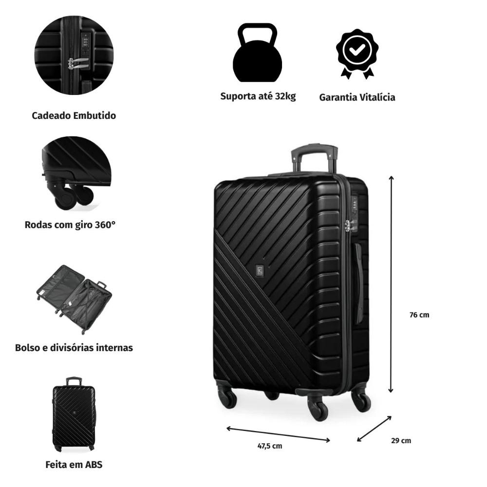 Mala Detroit Grande A Detroit combina praticidade e segurança, essa mala da Bagaggio é a escolha ideal. Esta mala de design simples, confeccionada em material resistente ABS, foi projetada para atender às necessidades dos viajantes modernos, oferecendo um amplo espaço interno e recursos organizacionais que tornam a sua viagem mais tranquila e conveniente. Disponível nas cores: Preto, Prata, Rose, Lilas Principais Atributos - Cadeado:A mala de viagem Detroit, conta com cadeado embutido ideal para garantir uma segurança extra, no momento de viajar. - Alça Lateral: A alça lateral resistente facilita o transporte da mala, seja ao subir escadas, colocá-la no porta-malas do carro ou retirá-la da esteira de bagagem no aeroporto. - Rodas 360°: As rodinhas 360° permitem que você gire sua mala para qualquer direção, sem esforço nenhum. Elas são uma ótima opção para quem viaja muito e precisa se locomover para vários lugares de forma rápida e fácil. - Espaço interno: Com a Mala Detroit, você terá espaço de sobra para suas roupas e pertences pessoais. Seja para viagens curtas ou longas, essa mala oferece um espaço generoso para acomodar tudo o que você precisa. Além disso, ela possui divisórias internas simples com bolsos e elásticos com trava, proporcionando flexibilidade para manter seus itens no lugar durante o transporte. Dessa forma, você evita bagunças indesejadas e mantém tudo em ordem. Material - ABS Devido às suas excelentes propriedades mecânicas, o ABS é um material bastante resistente e flexível. Além disso, ele é perfeito para malas, pois é leve, fácil de limpar e proporciona qualidade ao produto. Tamanho disponível P: A: 55cm L: 35cm x P: 23cm M: A: 66cm x L: 41,5cm x P: 26cm G: A: 76cm x