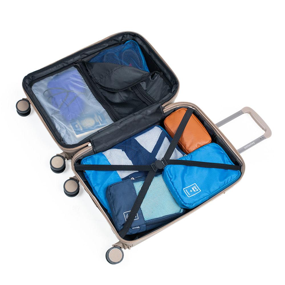 Mala Seul A mala Seul é desenvolvida 100% em polipropileno, de altíssima qualidade, feito com materiais resistentes e duráveis. Possui rodinhas 360° destacáveis, facilitando diversos processos ao longo de uma viagem. Além disso é possui um amplo espaço interno, ainda mais pela sua característica expansiva. Design elegante e moderno, ideal para quem viaja com frequência. Disponível nas cores: Bege e Roxo. Principais Atributos - Cadeado: A mala de viagem Seul, conta com cadeado TSA flat garantindo segurança no momento de viajar. - Rodas 360°: As 4 rodas são duplas com giro 360° permitindo que você gire sua mala para qualquer direção, sem esforço nenhum. Elas são uma ótima opção para quem têm muitas malas em casa, pois possui rodas destacáveis, sendo possível guardar uma mala dentro da outra. - Espaço interno: A mala Seul possui diversos bolsos internos especiais, ideais para manter seus itens no lugar. Modelo expansível. - Material – Polipropileno. Material bastante resistente e rígido. Além disso, ele é ideal para malas, pois não penetra água e protege tudo o que está dentro da mala. Tamanhos disponíveis: P: 78,5 X 51 X 30 CM M: 78,5 X 51 X 30 CM G: 78,5 X 51 X 30 CM Bagaggio responde - Esse produto possui garantia? Sim, a mala Seul conta com 3 anos de garantia para defeitos de fábrica. - Quantos kg essa mala comporta? A mala Seul comporta um peso de 10Kg. - Posso levá-la comigo dentro do avião? A mala Seul modelo P NÃO pode ser levada com você dentro do avião, precisa de despacho. Rodas 360º: Rodas 360° As rodas com giro 360º facilitam o deslocamento da mala, fazendo com que ela possa ser conduzida em qualquer direção, sem precisar incliná-la e sem fazer esforço. Amplo espaço interno: