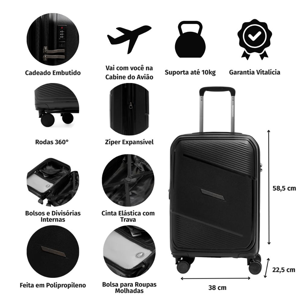 Mala de Viagem Pequena 10 Kg Polipropileno 4 Rodas Seul Preta