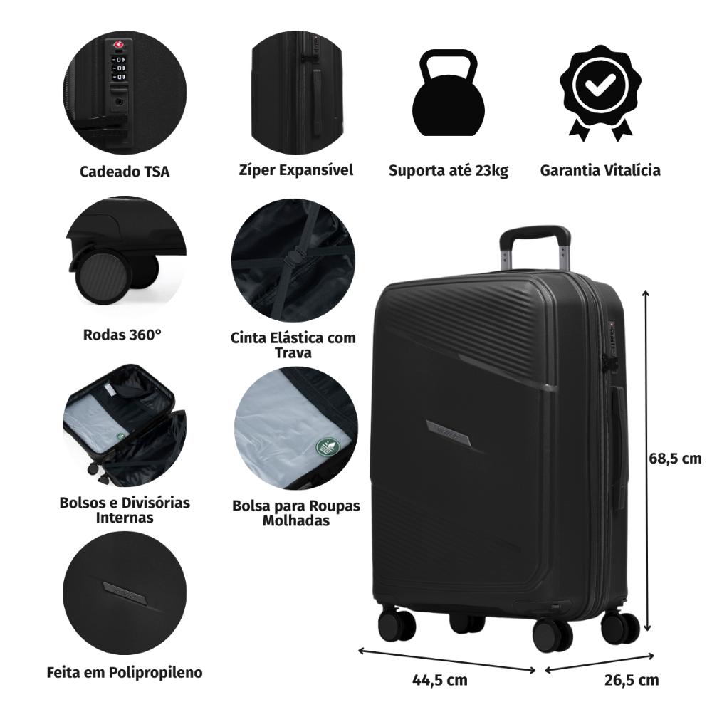 Mala Média 23 Kg Polipropileno 4 Rodas Seul Preta