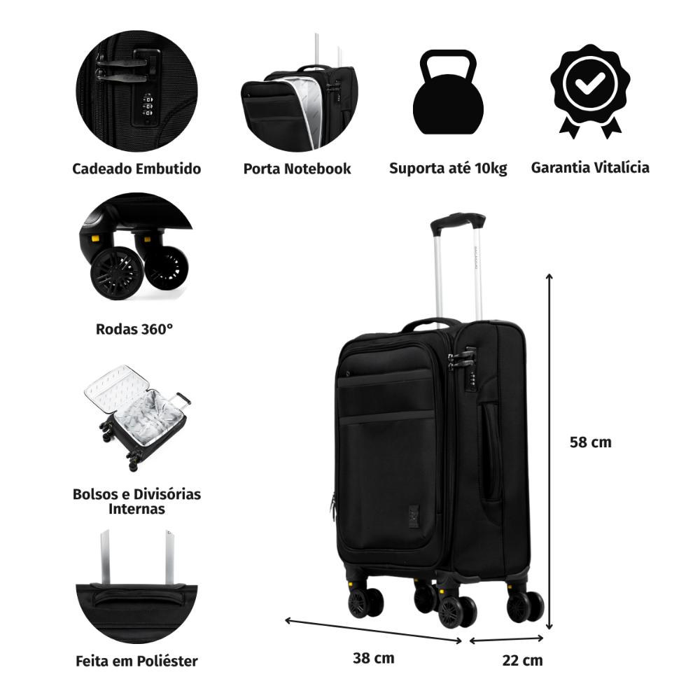 A Mala Lyon é a escolha ideal para aqueles que gostam de viajar com mais conforto. Ela possui organização inteligente e torna as suas viagens mais convenientes e organizadas. Principais Características: - Amplo espaço interno: Com capacidade generosa, a Mala Lyon acomoda as suas roupas, acessórios e itens pessoais com facilidade. - Materiais Duráveis: Produzida em poliéster, nossa mala é projetada para resistir ao desgaste das viagens frequentes, garantindo a sua longa durabilidade. Seu tamanho permite que seja levada no interior do Avião. Possui 4 rodas simples com giro 360º, alça de mão superior e cadeado fixo, para sua maior segurança. Sua parte interna é simples e espaçosa. Rodas 360º: Rodas 360° As rodas com giro 360º facilitam o deslocamento da mala de viagem, fazendo com que ela possa ser conduzida em qualquer direção, sem precisar incliná-la e sem fazer esforço. Amplo espaço interno: Amplo compartimento Interno A mala de viagem conta com divisórias simples e elásticos com trava, ideais para manter seus itens no lugar. Além disso, ela possui amplo espaço interno. Cadeado com Senha: Cadeado com senha embutido O cadeado com senha vem embutido na mala. Nele, você cadastra uma senha numérica para prender os fechos e viajar com mais segurança. Mala de Poliéster: Mala de Poliéster Feita a partir de fibras sintéticas, a mala de viagem de poliéster, garante resistência, durabilidade e uma fácil manutenção, sendo uma excelente escolha para quem busca uma mala de qualidade e mais barata. Além disso,