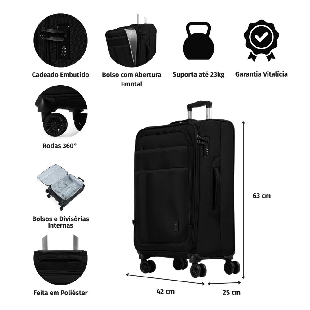 A Mala Lyon é a escolha ideal para aqueles que gostam de viajar com mais conforto. Ela possui organização inteligente e torna as suas viagens mais convenientes e organizadas. Principais Características: - Amplo espaço interno: Com capacidade generosa, a Mala Lyon acomoda as suas roupas, acessórios e itens pessoais com facilidade. - Materiais Duráveis: Produzida em poliéster, nossa mala é projetada para resistir ao desgaste das viagens frequentes, garantindo a sua longa durabilidade. Seu tamanho permite que seja levada no interior do Avião. Possui 4 rodas simples com giro 360º, alça de mão superior e cadeado fixo, para sua maior segurança. Sua parte interna é simples e espaçosa. Rodas 360º: Rodas 360° As rodas com giro 360º facilitam o deslocamento da mala de viagem, fazendo com que ela possa ser conduzida em qualquer direção, sem precisar incliná-la e sem fazer esforço. Amplo espaço interno: Amplo compartimento Interno A mala de viagem conta com divisórias simples e elásticos com trava, ideais para manter seus itens no lugar. Além disso, ela possui amplo espaço interno. Cadeado com Senha: Cadeado com senha embutido O cadeado com senha vem embutido na mala. Nele, você cadastra uma senha numérica para prender os fechos e viajar com mais segurança. Mala de Poliéster: Mala de Poliéster Feita a partir de fibras sintéticas, a mala de viagem de poliéster, garante resistência, durabilidade e uma fácil manutenção, sendo uma excelente escolha para quem busca uma mala de qualidade e mais barata. Além disso,
