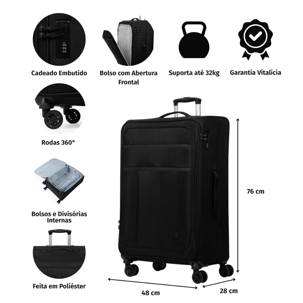A Mala Lyon é a escolha ideal para viagens de média duração ou para aqueles que gostam de viajar com um pouco mais de conforto. Com espaço amplo e múltiplos compartimentos para uma organização inteligente, esta mala torna as suas viagens mais convenientes. Principais Características: Espaço Inteligente: Com capacidade generosa, a Mala Lyon acomoda as suas roupas, acessórios e itens pessoais com facilidade. Materiais Duráveis: Produzida em poliéster, nossa mala é projetada para resistir ao desgaste das viagens frequentes, garantindo a sua longa durabilidade. Com quatro rodinhas 360. Rodas 360º: Rodas 360° As rodas com giro 360º facilitam o deslocamento da mala de viagem, fazendo com que ela possa ser conduzida em qualquer direção, sem precisar incliná-la e sem fazer esforço. Amplo espaço interno: Amplo compartimento Interno A mala de viagem conta com divisórias simples e elásticos com trava, ideais para manter seus itens no lugar. Além disso, ela possui amplo espaço interno. Cadeado com Senha: Cadeado com senha embutido O cadeado com senha vem embutido na mala. Nele, você cadastra uma senha numérica para prender os fechos e viajar com mais segurança. Mala de Poliéster: Mala de Poliéster Feita a partir de fibras sintéticas, a mala de viagem de poliéster, garante resistência, durabilidade e uma fácil manutenção, sendo uma excelente escolha para quem busca uma mala de qualidade e mais barata. Além disso, ele proporciona uma ótima retenção de cor, o que permite com que sua mala pareça nova por ba