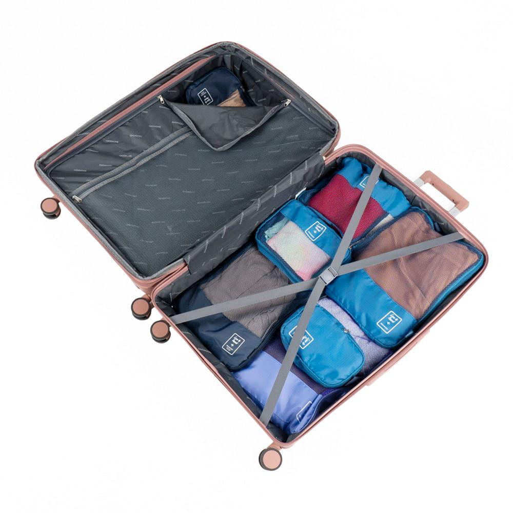 Mala Cartagena, feita em polipropileno resistente, combina durabilidade com um design moderno de textura em relevo. Equipada com rodas duplas 360° removíveis, que facilitam a locomoção e podem ser retiradas em voos, oferece transporte ágil e prático. Possui cadeado embutido, zíper expansível para ampliar a capacidade, alças de mão superior e lateral e suportes que permitem apoiar a mala em esteiras ou balcões sem risco de danificar o acabamento. Por dentro, traz divisórias com zíper, elásticos e bolsos organizadores para manter seus pertences seguros e no lugar durante toda a viagem.