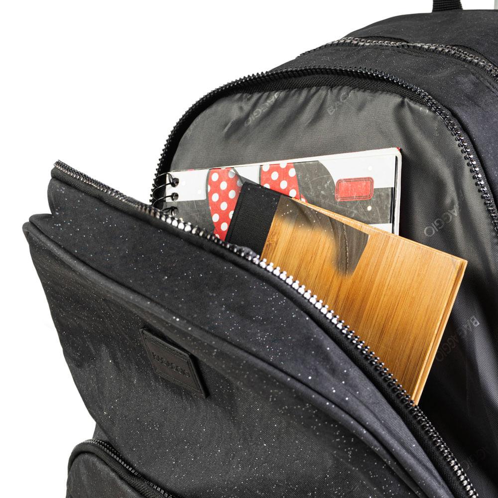 Mochila Escolar Juvenil Feminina com 4 Rodinhas Crinkle Glitter PretaMaterial: PoliésterTamanho: 44 x 32 x 16 cmPeso: Mochila: 0,5 kgCapacidade: 22,5 LGarantia: 90 diasFaixa etária: Juvenil (12+anos)Outros atributos: - Três compartimentos amplos. - Rodas 360°- Bolso lateral para garrafa.