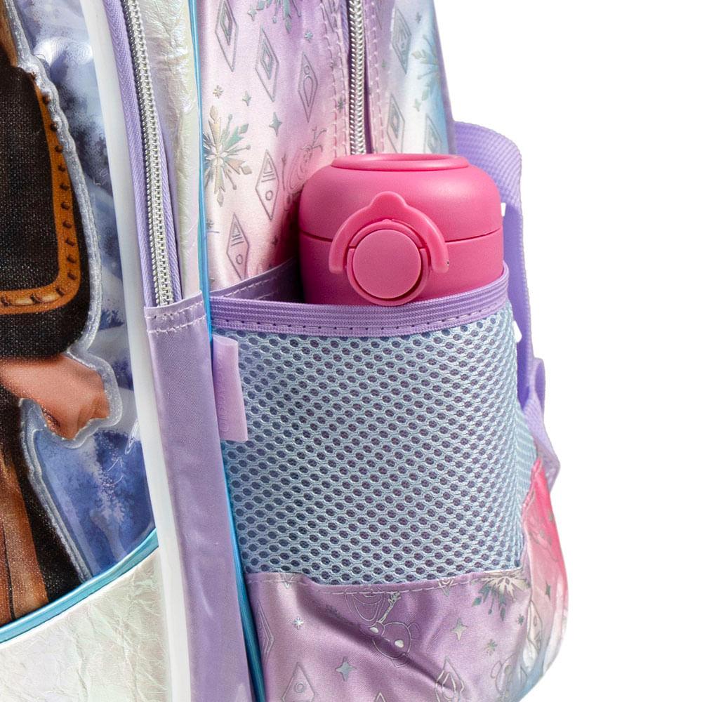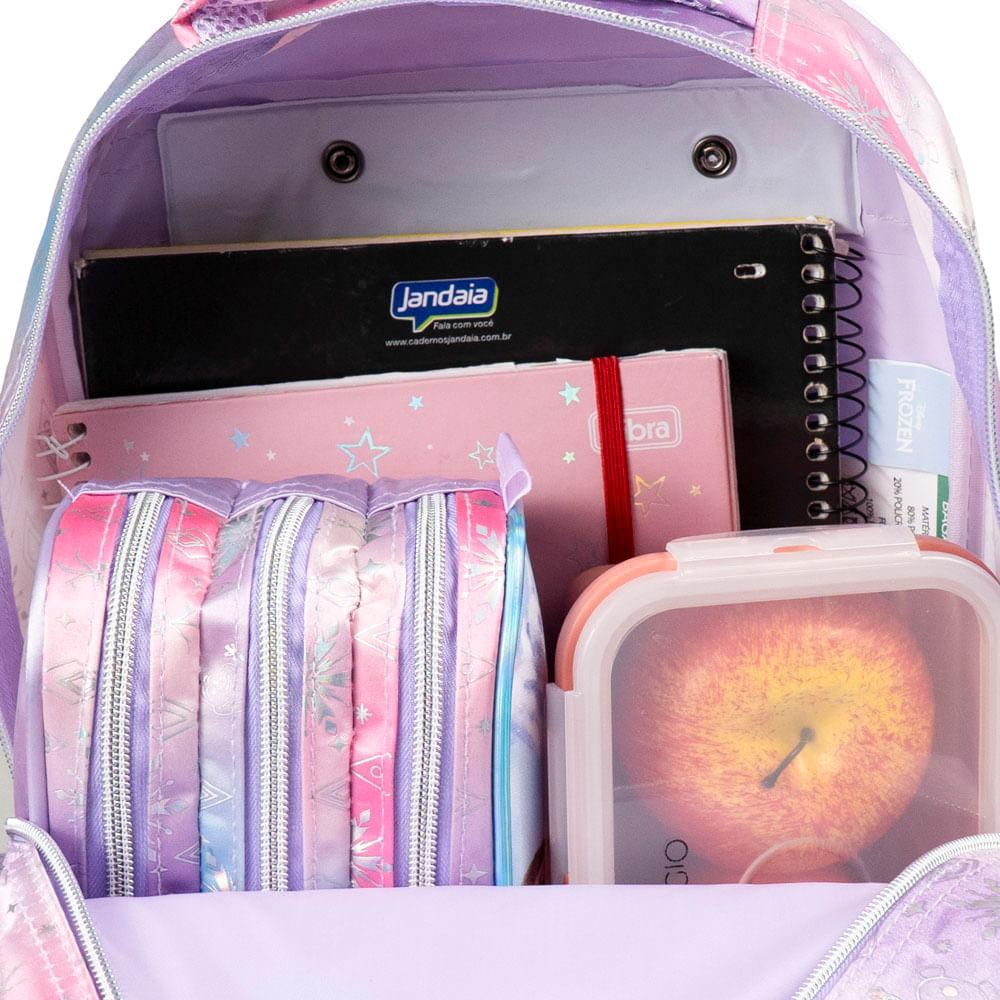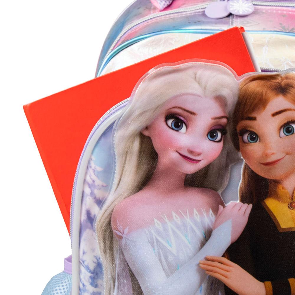A Mochila de Rodinha Infantil Feminina Frozen Azul Claro chega para acompanhar a rotina escolar com um toque mágico que só Elsa e Anna conseguem trazer. Ela combina painel frontal com iluminação LED, material iridescente e detalhes holográficos, criando um visual que encanta de longe — e ainda ajuda na segurança, já que a criança fica mais visível. É ideal para quem quer uma mochila de rodinhas bonita, resistente e cheia de funcionalidades pensadas para o dia a dia.Organização e Espaço InternoPara facilitar a rotina escolar, essa mochila conta com compartimento principal amplo, perfeito para levar cadernos, estojo, pasta, agenda e lancheira sem aperto. Os bolsos laterais em tela são ideais para garrafinhas, mantendo tudo acessível e organizado. Os zíperes com puxadores especiais temáticos garantem uma abertura fácil para as mãos pequenas e reforçam o charme Frozen em cada detalhe.Detalhes que transformam a experiênciaO grande diferencial está no painel frontal com luzes LED acionadas por botão, oferecendo diferentes intensidades de brilho — um recurso divertido e funcional. A combinação do material iridescente com a estampa holográfica cria um efeito cintilante que muda conforme a luz. A arte de Elsa e Anna possui acabamento em alto relevo, deixando o visual ainda mais especial.Mobilidade e conforto no dia a diaA mochila vem com rodinhas resistentes, alça retrátil e estrutura leve, facilitando o transporte para crianças pequenas. A base reforçada traz estabilidade, garantindo que a mochila não tombe quando estiver cheia. É uma escolha excelente para quem busca durabilidade, beleza e uma experiência realmente prática para a rotina escolar.O que torna este modelo único no mix BagaggioO conjunto LED + material iridescente + holografia + arte frontal em alto relevo faz deste modelo o mais impactante visualmente da linha Frozen. É a mochila perfeita para as fãs do filme que querem algo que realmente se destaque.FAQA luz LED é recarregável?Não. O painel funciona com bateria interna substituível e possui botão de acionamento.A mochila é indicada para qual idade?É ideal para crianças da educação infantil e primeiros anos do fundamental, com tamanho proporcional e fácil de manejar.Cabe todo o material escolar do dia a dia?Sim! O compartimento principal comporta cadernos grandes, apostilas, estojo e lancheira.As rodas são resistentes?Sim. As rodinhas são feitas para uso escolar diário, com deslize leve e base reforçada.O painel frontal acende mesmo com peso dentro?Sim. A iluminação LED é independente da estrutura interna.Especificações: Material: PoliésterTamanho: 41 x 29 x15 cmPeso: Mochila: 1,15 kgCapacidade:17,8 LGarantia: 90 diasFaixa etária: Infantil (3 a 8 anos)Outros atributos: - Tag de Identificação- Zíper Personalizado.- Frontal com iluminação LED . - Rodinha de silicone.- Bolso lateral para garrafa.