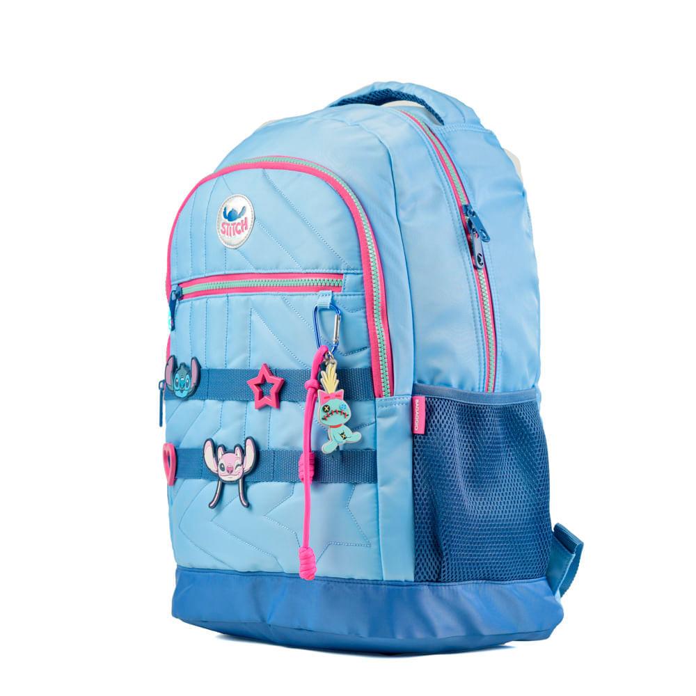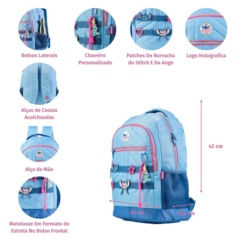 Mochila Stitch Star 26T AzulA Mochila Stitch acompanha os pequenos na rotina escolar com muito charme e diversão. Com tamanho ideal para levar livros, cadernos e acessórios, é perfeita para transformar cada dia de aula em uma aventura ao lado do personagem favorito.Especificações: Material: PoliésterTamanho: 46 x 33,5 x 21 cmPeso: Mochila: 0,450kgCapacidade: 32,3LGarantia: 90 diasFaixa etária: Infanto Juvenil (8 a 12 anos)Outros atributos: - Chaveiros personalizados. - Frontal com patches do Stitch.- Bolso lateral para garrafa