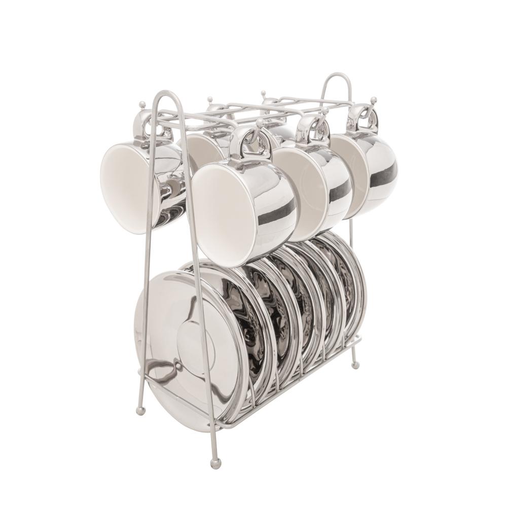 6 Xícaras de Café Wolff Versa de Porcelana Prata Branco 90mlConjunto 6 Xícaras de Café com Pires de Porcelana e Suporte Versa Prata/Branco 90ml - WolffDesfrute de momentos de elegância e praticidade com o Conjunto de 6 Xícaras de Café com Pires de Porcelana e Suporte Versa Prata/Branco 90ml da Wolff.Design SofisticadoCada xícara e pires apresenta um design moderno em branco, com detalhes em prata no suporte, adicionando um toque de elegância à sua mesa de café.Porcelana de QualidadeFabricadas com porcelana de alta qualidade, as xícaras e pires são duráveis, resistentes e mantêm a temperatura do café por mais tempo, garantindo uma experiência de degustação perfeita.Capacidade IdealCom capacidade para 90ml, as xícaras são perfeitamente dimensionadas para servir porções generosas do seu café favorito, proporcionando momentos de prazer a cada gole.Suporte PráticoO suporte prata oferece uma maneira conveniente de armazenar e exibir as xícaras e pires, mantendo sua mesa organizada e elegante.Conjunto CompletoCom seis xícaras, seis pires e um suporte incluídos, este conjunto é perfeito para receber convidados ou desfrutar de momentos especiais em família.Adicione um toque de charme e requinte à sua mesa de café com o Conjunto de 6 Xícaras de Café com Pires de Porcelana e Suporte Versa Prata/Branco 90ml da Wolff.WOLFF. A melhor experiência em receber, servir e decorar!Contém: 6 Xícaras 90Ml 8,1X6,3X5,2Cm / 6 Pires 12X1,8Cm / 1 SuporteLava Louça: NãoMicroondas: NãoForno: NãoFogão: NãoFreezer: NãoMedidas Produto: Altura 14,00cm x Largura 18,50cm x Comprimento 26,50cmPeso: 1,77KgCor: PrataMaterial: PorcelanaLavar com detergente neutro, esponja macia e secar imediatamente. Não utilizar outros produtos químicos.