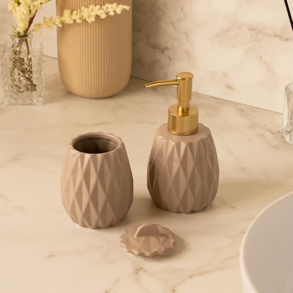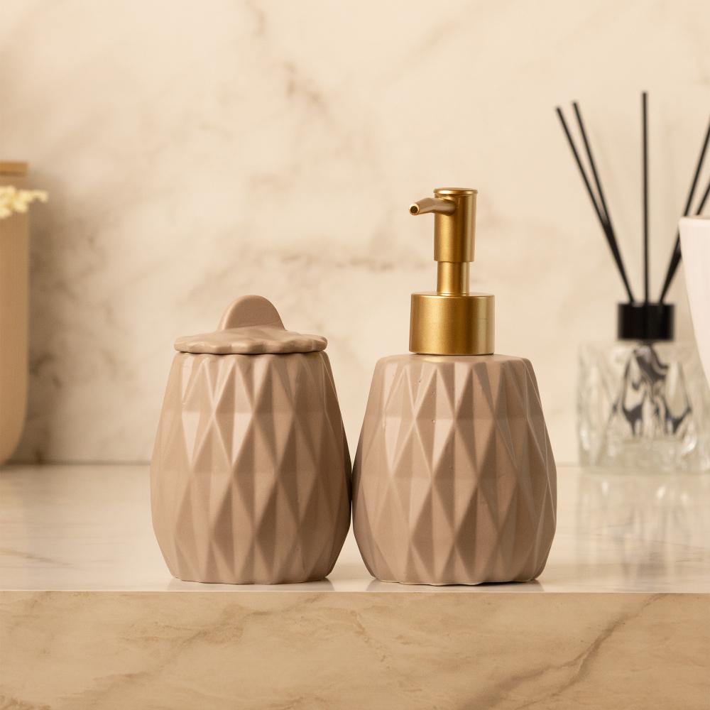 Conjunto 2 Peças para Banheiro Lyor Ananás BegeConjunto 2 Peças para Banheiro Ananás Bege Cerâmica - LyorAdicione charme e organização ao seu lavabo.O Conjunto Ananás Lyor é a solução perfeita para organizar sua bancada com sofisticação. O design geométrico texturizado, inspirado no abacaxi, e a cor bege suave trazem um toque moderno e aconchegante para o ambiente.Design Geométrico AnanásO corpo das peças possui um relevo facetado inspirado no abacaxi, adicionando uma textura moderna e um charme único.Organização CompletaInclui um porta sabonete líquido com dosador dourado e um pote com tampa, ideal para algodão ou cotonetes.Material de QualidadeFabricado em cerâmica, garante peso, estabilidade e durabilidade, ideal para o uso diário em ambientes úmidos.Cor Bege VersátilA tonalidade neutra e aconchegante se integra facilmente a diversos estilos de decoração de banheiro.A Lyor oferece soluções completas para tornar seu lar mais charmoso e funcional. Nossas peças são pensadas para quem busca praticidade e beleza no dia a dia.Contém: Jogo de BanheiroMedidas Produto: Altura 12,40cm x Largura 7,90cm x Comprimento 15,50cmPeso: 0,37KgLavar com detergente neutro, esponja macia e secar imediatamente.