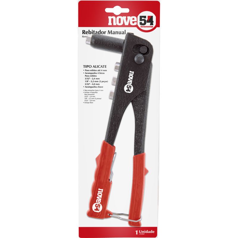 Conteúdo da embalagem1 Rebitador. Acompanha: 1 bico de 2,4 mm (3/32"), 2 bicos de 3,2 mm (1/8"), 1 bico de 4,0 mm (5/32") e 1 chave.Aplicações e dicas de usoIndicado para unir peças, como: chapas, tubos, perfis, entre outras, através de rebites de repuxoDestaques e diferenciaisPossui corpo em chapa de aço estampado, proporcionando maior resistência, e cabo plastificado para maior conforto durante o manuseio DETALHES TÉCNICOS Material do corpo do rebitador: Aço estampado Quantidade de bicos do rebitador: 04 bicos Comprimento total do rebitador: 240,0 mm Altura do rebitador: 90,0 mm Diâmetro máximo de rebite: 4,0 mm Tipo do rebite indicado: Alumínio