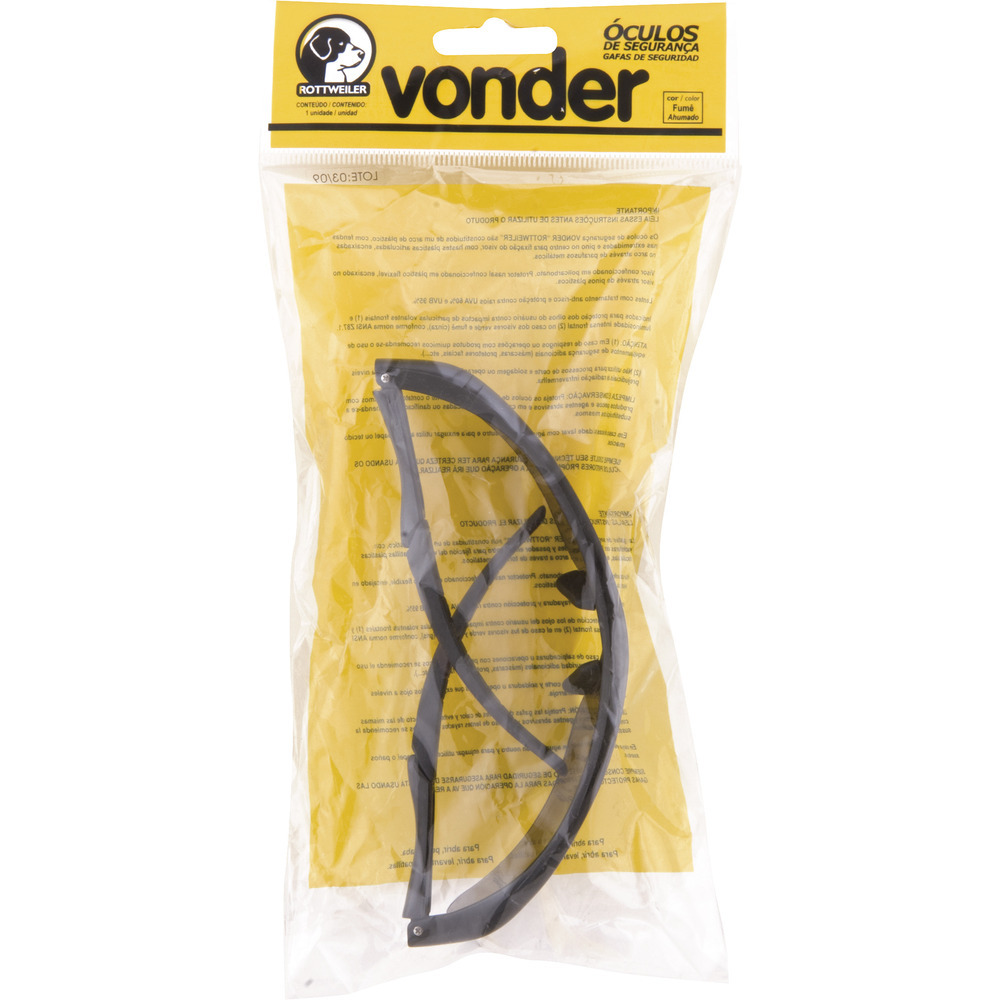 Conteúdo da embalagem1 Óculos de segurançaAplicações e dicas de usoIndicado para proteção dos olhos do usuário contra partículas volantes e para ambientes com alta luminosidadeDestaques e diferenciaisPossui lentes em policarbonato com tratamento anti-risco e proteção contra raios UVA 60% e UVB 95%, proporcionando maior durabilidade e ótima resistência. Produto em conformidade com a norma ANSI Z87.1. DETALHES TÉCNICOS Modelo do óculos de segurança: Rottwweiler Número do Certificado de Aprovação - CA: 15009 Material da lente do óculos de segurança: Policarbonato Cor da lente do óculos de segurança: Fumê (cinza) Material da haste do óculos de segurança: Plástico