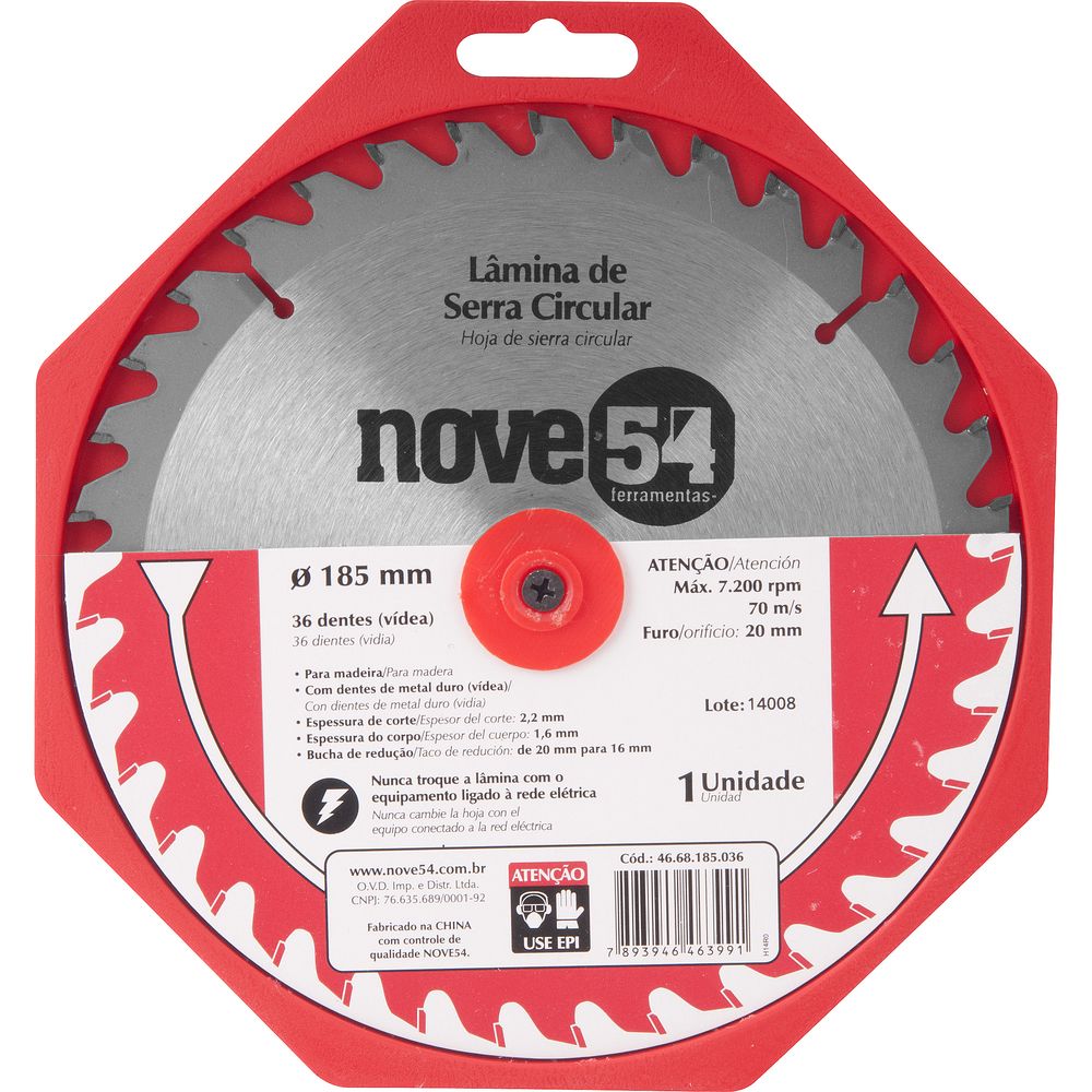 Conteúdo da embalagem1 Lâmina de serra circularAplicações e dicas de usoIndicada para cortar madeiras e derivados. Nunca exceder a rotação máxima (rpm) - risco de acidente e/ou queima da lâmina. Não cortar madeiras impregnadas com massa ou cimento.Destaques e diferenciaisCorpo em aço carbono com dentes de metal duro/vídea que proporcionam maior vida útil DETALHES TÉCNICOS Diâmetro da lâmina de serra circular: 7.1/4" - 185 mm Número de dentes da lâmina de serra circular: 36 dentes Espessura de corte da lâmina de serra circular: 2,2 mm Espessura do corpo da lâmina de serra circular: 1,6 mm Diâmetro do furo da lâmina de serra circular: 20 mm Rotação máxima da serra circular: 7.200 rpm Velocidade periférica: 70 m/s