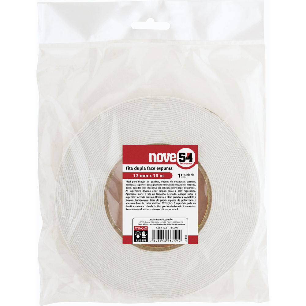 Fita Dupla Face Espuma 19mmx10m Branca Nove54A Fita Dupla Face Espuma da Nove54 é a escolha perfeita para quem busca praticidade e eficiência na fixação de objetos sem a necessidade de furar paredes. Com 19mm de largura e 10m de comprimento, esta fita adesiva é ideal para fixar quadros, objetos de decoração, cartazes, molduras, suportes, peças plásticas e metálicas em superfícies como azulejo, madeira, gesso e paredes lisas. Feita de espuma de poliuretano com liner de papel e adesivo, a fita garante uma fixação segura e duradoura, mantendo a estética limpa e organizada dos seus ambientes. Além disso, a fita é branca, o que a torna discreta e versátil para diversas aplicações.**ESPECIFICAÇÕES TÉCNICAS**- Tipo de fita adesiva: Embalagem- Marca: Nove54- Código universal de produto: 7893946467517- Comprimento: 10 m- Largura: 19 mm- Espessura: 1,20 mm- Material: Liner de papel, espuma de poliuretano e adesivo- Cor: Branca**FUNÇÕES E CARACTERÍSTICAS**- Ideal para fixação de quadros e objetos de decoração- Compatível com azulejo, madeira, gesso e paredes lisas- Não recomendada para papel de parede**INSTRUÇÕES DE USO**1. Limpe a superfície onde a fita será aplicada para garantir a máxima adesão.2. Corte a fita no tamanho desejado.3. Aplique a fita na superfície, pressionando firmemente.4. Para remoção, puxe a fita lentamente para evitar danos à superfície.**ORIGEM DO PRODUTO**- Local de fabricação: Brasil**ITENS INCLUSOS**- 1 Fita dupla face de 19mm x 10mTransforme seu espaço com facilidade e sem complicações! Adquira já a Fita Dupla Face Espuma da Nove54 e aproveite a praticidade da fixação sem furos.