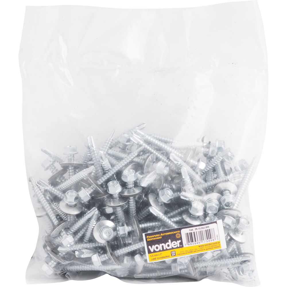 Parafuso Autobrocante Sextavado 5,5x2" – Fixação Segura e Durável para Coberturas Metálicas Procurando uma solução eficiente e resistente para fixar telhas e chapas metálicas? O Parafuso Autobrocante Sextavado 5,5x2" da Vonder é a escolha ideal para construções e reformas que exigem durabilidade e estanqueidade. Com um diâmetro de 5,5 mm e comprimento de 2 polegadas, ele garante uma fixação robusta em coberturas e união de encontros de telhas metálicas. Sua grande vantagem reside na robustez: fabricado em aço carbono de alta resistência e com acabamento zincado, o parafuso oferece proteção premium contra corrosão e oxidação, garantindo longa vida útil mesmo em ambientes expostos a intempéries. O design inteligente incorpora duas arruelas (uma de aço e uma de neoprene), criando um selamento perfeito que impede infiltrações de água e garante máxima estanqueidade. A cabeça sextavada permite aplicação de torque elevado sem desgaste da ferramenta, facilitando a instalação rápida e segura. Indicado para uso profissional em construção civil, o kit Vonder vem completo com 100 peças, otimizando seu custo-benefício para projetos de médio e grande porte. Escolha a eficiência técnica e a segurança que apenas o parafuso autobrocante Vonder pode oferecer para o seu telhado. Especificações Material do parafuso autobrocante: Aço carbono Acabamento do parafuso autobrocante: Zincado Diâmetro do parafuso autobrocante: 5,5 mm Comprimento do parafuso autobrocante: 2" Medida do sextavado do parafuso autobrocante: 0.5/16 polegadas Garantia legal: 90 dias Itens Inclusos 100 Parafusos autobrocantes cabeça sextavada 5,5x2" Perguntas Frequentes (FAQ) Pergunta: Para que tipo de material este parafuso é indicado?Resposta: Ele é ideal para fixação de coberturas e telhados metálicos, união de encontros de telhas e fixação de chapas finas. Pergunta: O parafuso possui proteção contra ferrugem?Resposta: Sim, o material é aço carbono com acabamento zincado, proporcionando maior resistência contra oxidação e corrosão. Pergunta: Este parafuso já vem com a arruela?Resposta: Sim, ele conta com arruela de aço incorporada e arruela de neoprene para garantir estanqueidade. Pergunta: Qual é a garantia do produto?Resposta: Garantia legal de 90 dias.