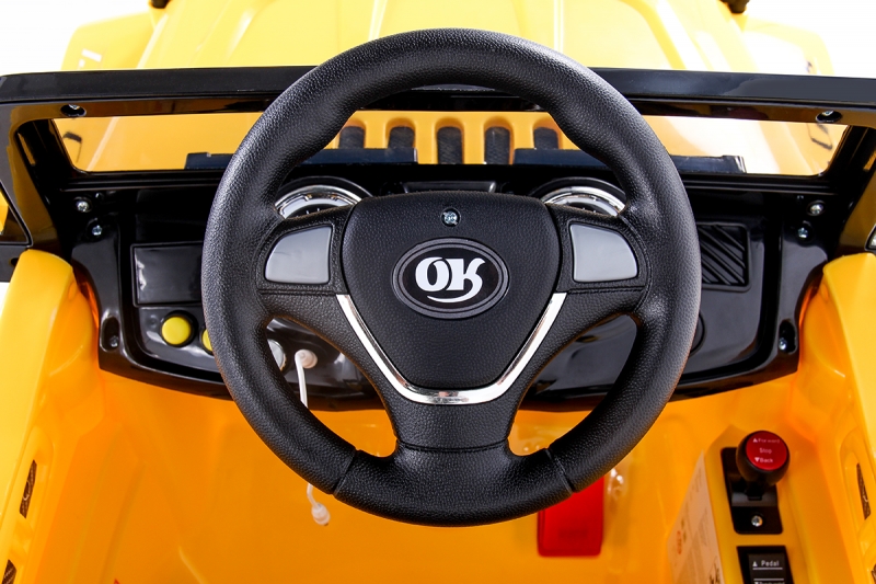 Direção com 2 botões 1 para buzina e outro tocar música infantil Entrada para ipod / Mp3 Botão de Liga/Desliga Botão de seleção para escolha de uso pelo controle ou pela criança Pode ser controlado pela criança ou por um adulto através do controle remoto Pedal para que a criança possa acelerar Cinto de segurança para prender a criança Especificações: Idade Recomendada: Acima de 3 anos Capacidade: Até aprox. 30 Kg. 2 Velocidade: 2.5 km/H - 2.5 ~ 5 Km/H Carregador: Entrada 100 – 240 VAC 0,3A 50/60HZ Carregador: 12 VDC 1000mA Fusível: 4 A e 13 A Tempo de carga: Entre 8 - 12 Horas. 2 Bateria: 6V 4Ah e 6V 7 Ah Controle remoto funciona com 2 pilhas AA (Não Incluidas) Tamanho: 110 X 61 X 63 Ref. 927600 - Amarelo Quantidade por caixa: 1 unidade.