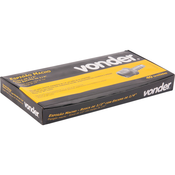 Conteúdo da embalagem40 EspigõesAplicações e dicas de usoIndicado para conectar mangueiras de 1/2" em redes de ar comprimidoDestaques e diferenciaisFabricado em aço zincado, proporcionando boa resistência à oxidação/corrosão DETALHES TÉCNICOS Medida da rosca do espigão para mangueira: 0.1/2 " Tipo da rosca do espigão para mangueira: NPT - Macho Medida da escama do espigão para mangueira: 0.1/4 " Material do espigão para mangueira: Aço zincado