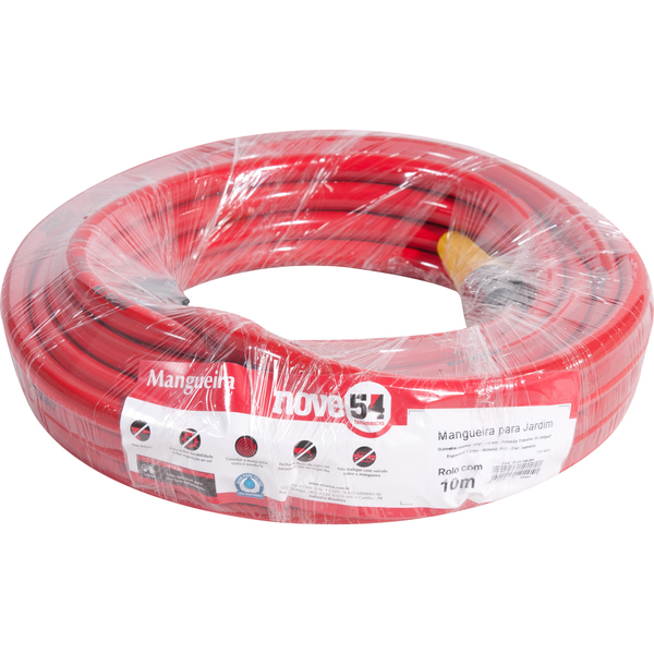 Cod. do Fornecedor: 3121100001Marca: Nove54Conteúdo da embalagem: 1 Mangueira para jardim 1/2'' vermelha com 10 metros Nove54 Com parede dupla, pronta para uso, acompanha conexão da torneira e esguicho reto de plástico.Indicada para condução de água fria na limpeza e irrigação de jardins, uso domestico.Garantia legal: 90 dias + Garantia contratual: 3 meses Detalhes TécnicosDiâmetro interno: 7/16" - 11,1 mmEspessura da parede: 1,5 mmCor da mangueira: VermelhaMaterial da mangueira: PVCPressão máxima de trabalho: 61 lbf/pol²Massa aproximada (peso): 0,780 kg