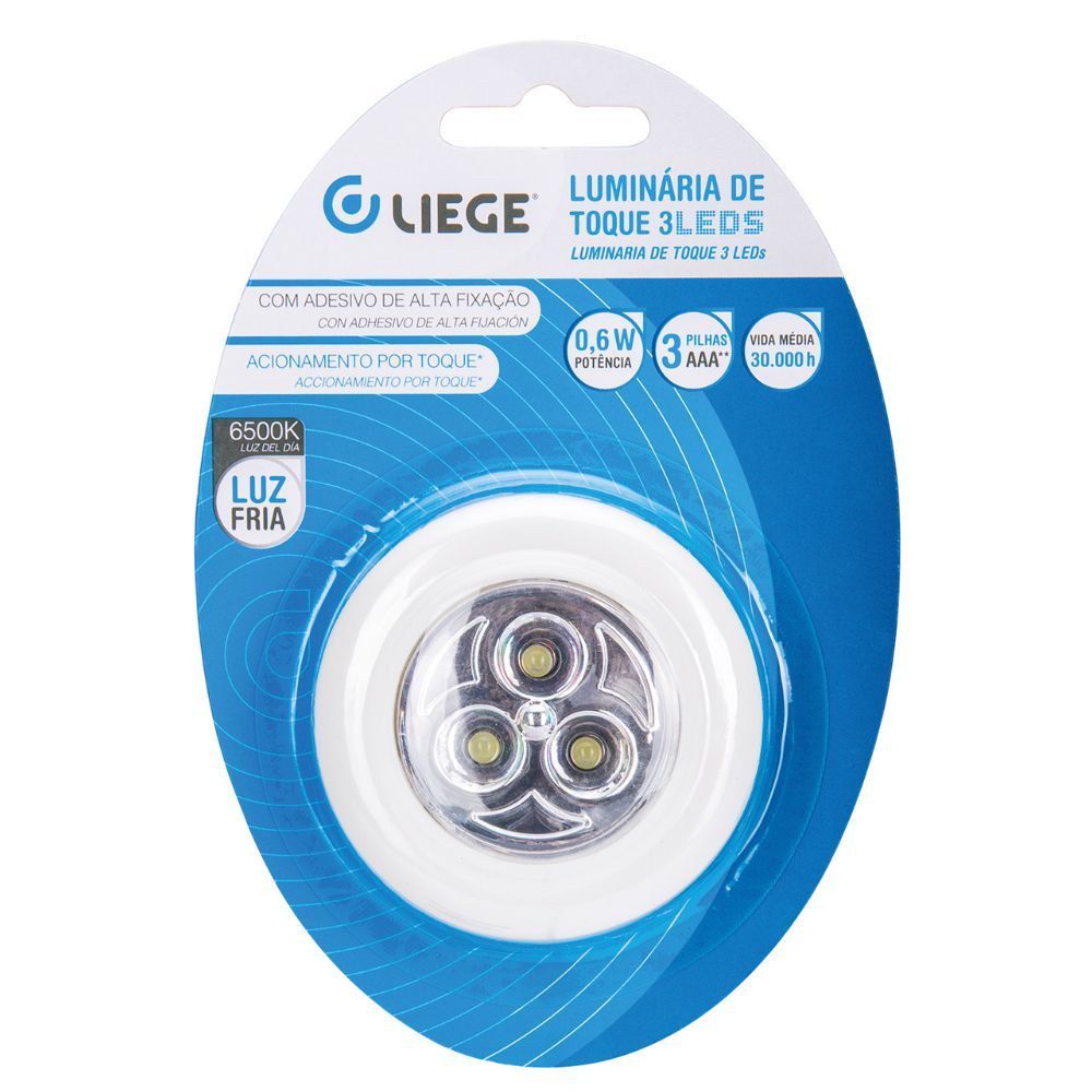 Código do Fornecedor: 858226 Marca: Liege Conteúdo da embalagem: 1 Luminária LED 0,6W De Toque Redonda Branca Pilha AAA Liege Luz branca de longa duração; Leve e prática; Liga/desliga pressionando a lente; Possui fita adesiva de alta fixação na parte traseira do produto; Aderente a superfícies: de couro, madeira, plástico, vidro e metal; Utiliza 03 pilhas AAA (não inclusas). Detalhes Técnicos:Potência: 0,6WNúmero de LEDs: 3Modelo: RedondoCor: Branca OBS: Não acompanha pilhas Garantia: 3 meses