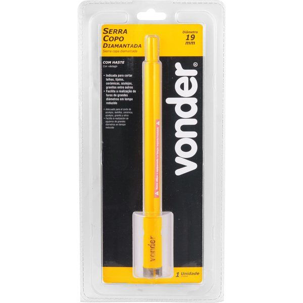 Serra Copo Diamantada 19mm Haste e Pino Guia Vonder é a ferramenta ideal para quem busca precisão e eficiência em cortes de grandes diâmetros. Fabricada pela renomada marca Vonder, esta serra copo é perfeita para cortar telhas, tijolos, cerâmicas, azulejos e granitos, garantindo um acabamento impecável. Com dentes diamantados, ela oferece durabilidade e resistência ao desgaste, proporcionando cortes precisos e rápidos. A Serra Copo Diamantada Vonder é compatível com diversos tipos de furadeiras, mas é importante verificar a potência mínima recomendada para garantir um desempenho eficaz. Antes de utilizar o pino guia, é necessário fazer um furo inicial com uma broca de vídea. Lembre-se de nunca utilizar o equipamento na função impacto/martelete para evitar danos à ferramenta e ao material.ESPECIFICAÇÕES TÉCNICAS:- Marca: Vonder- Código universal de produto: 7893946519353- Modelo: 7893946519353- Diâmetro da serra copo: 19 mm- Diâmetro do encaixe da haste: 9,5 mm- Comprimento total da haste: 170 mm- Material da serra copo: Corpo metálico com dentes diamantados (Aço carbono C45)ITENS INCLUSOS:- Serra Copo Diamantada 19mm- Haste- Pino GuiaINSTRUÇÕES DE USO:1. Faça um furo inicial com uma broca de vídea.2. Insira o pino guia no furo.3. Posicione a serra copo sobre o pino guia.4. Inicie o corte, mantendo a furadeira em baixa rotação.5. Nunca utilize a função impacto/martelete.