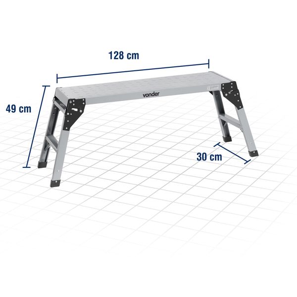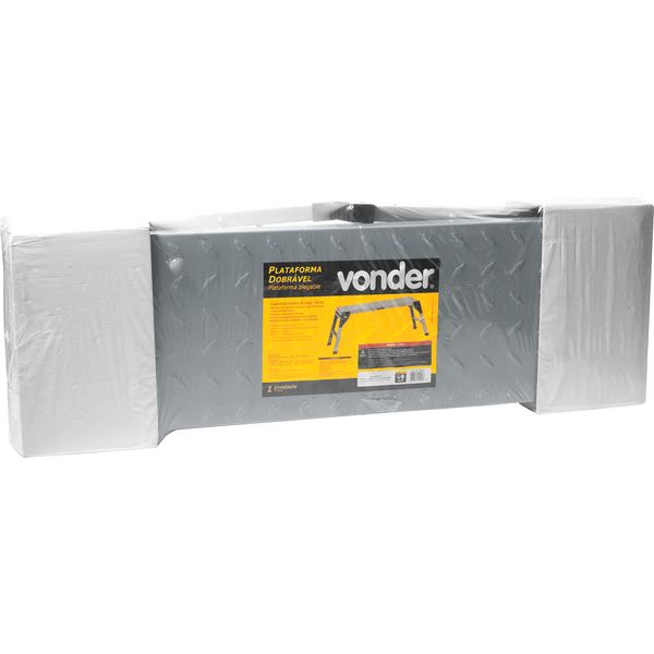 Plataforma Metálica Dobrável 150kg - VonderDescubra a praticidade e segurança da Plataforma Metálica Dobrável Vonder, ideal para facilitar o acesso a lugares elevados com total segurança. Com capacidade para suportar até 150 kg, esta plataforma é perfeita para uso doméstico ou industrial, garantindo que você alcance novos patamares com facilidade e confiança.Fabricada em aço resistente, a plataforma possui uma altura de 49 cm e é equipada com textura antiderrapante e proteção antideslizante nos pés, proporcionando estabilidade durante o uso. As duas travas de segurança são um diferencial que evita acidentes, enquanto o sistema de dobramento fácil facilita o armazenamento e transporte, tornando-a uma excelente escolha para quem busca praticidade.ESPECIFICAÇÕES TÉCNICAS:- Marca: Vonder- Modelo: 8501150000- Material: Aço- Capacidade de carga: 150 kg (considerando operador + ferramentas)- Dimensões da área de trabalho (C x L): 100 cm x 30 cm- Dimensões dobrado (C x L x A): 103 cm x 30 cm x 15 cm- Dimensões aberto (C x L x A): 128 cm x 30 cm x 49 cm- Código universal de produto: 7893946545536BENEFÍCIOS DO PRODUTO:A Plataforma Metálica Dobrável Vonder é uma solução versátil para quem precisa de acesso seguro a locais elevados. Seja em casa, para pequenos reparos, ou em ambientes industriais, sua estrutura robusta e segura garante eficiência e tranquilidade. Além disso, seu design dobrável permite fácil armazenamento, economizando espaço quando não está em uso.INSTRUÇÕES DE USO:1. Abra a plataforma completamente até ouvir o clique das travas de segurança.2. Certifique-se de que a superfície está nivelada antes de subir.3. Utilize sempre calçados antiderrapantes para maior segurança.4. Após o uso, dobre a plataforma e guarde em local seco e seguro.ITENS INCLUSOS:- 1 Plataforma dobrável