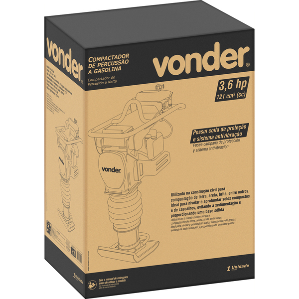 Conteúdo da Embalagem:1 Compactador de percussão. Acompanha carrinho para transporte.Destaques e diferenciais:Possui alta eficiência e fácil manuseio, com coifa de proteção, sistema antivibração, além de Motor Honda que proporciona excelente desempenho. Acompanha carrinho para auxiliar no transporte do equipamento.Aplicações e dicas de uso:Utilizado na construção civil para compactação de terra, areia, brita, entre outros. Ideal para nivelar e aprofundar solos compactos e de cascalhos, evitando a sedimentação e proporcionando uma base sólida para a colocação de alicerces, lajes de concreto, obras de tubulação de gás, tubulação de água, fundações, meios fios de calçadas, entre outros. A compactação do solo é uma etapa essencial na construção de barracões, edifícios, rodovias ou até mesmo preparando a sub-base para o piso de concreto.Detalhes TécnicosPotência: 3,6 hp Tipo de motor a combustão: 4 tempos - refrigerado a ar Sistema de partida: Manual retrátil Combustível: Gasolina comum Capacidade do tanque de combustível: 2,8 litros Capacidade de óleo no cárter: 300 ml Força de impacto: 13 kN Dimensões da sapata: 330 mm x 285 mm Dimensões (C x L x A): 705 mm x 345 mm x 1055 mmGarantiaGarantia legal: 90 dias + Garantia contratual: 9 meses